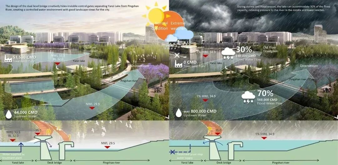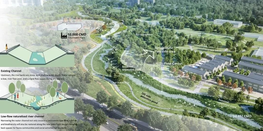 设计提出以河湖分离解决季节性水量不均的问题,发挥分洪与滞洪功能以舒缓洪水期中下游排洪压力,并以恢复缩窄低水河槽宽度至自然河貌断面来优化河流流动性,创造韧性可调适的水环境。