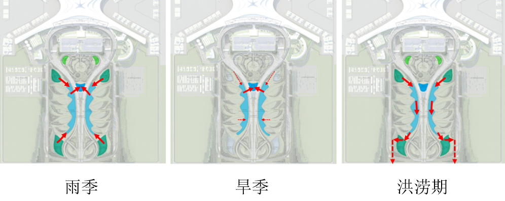 在雨季:积极利用绿色雨水基础设施收集、净化和蓄积雨水资源,将其作为景观水体补水,节约水资源且帮助削减洪峰;
