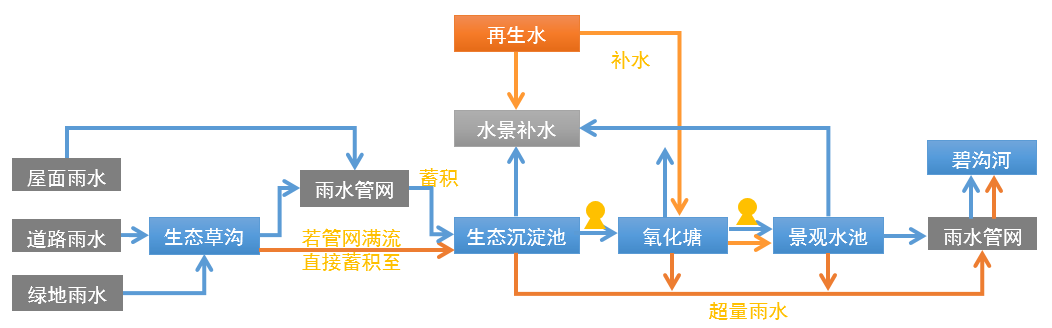 在旱季:蓄积的雨水资源不足时,采用再生水补给,维持水景景观;