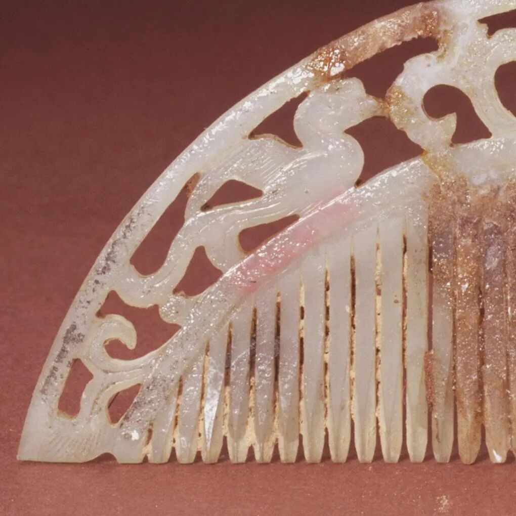 梳玉色白中略青,半圆形,薄片状。外弧饰镂空花鸟纹,中部为3朵花,两侧各有一鸟。梳齿集于下弦,齿密而间距细小,底端平齐。
