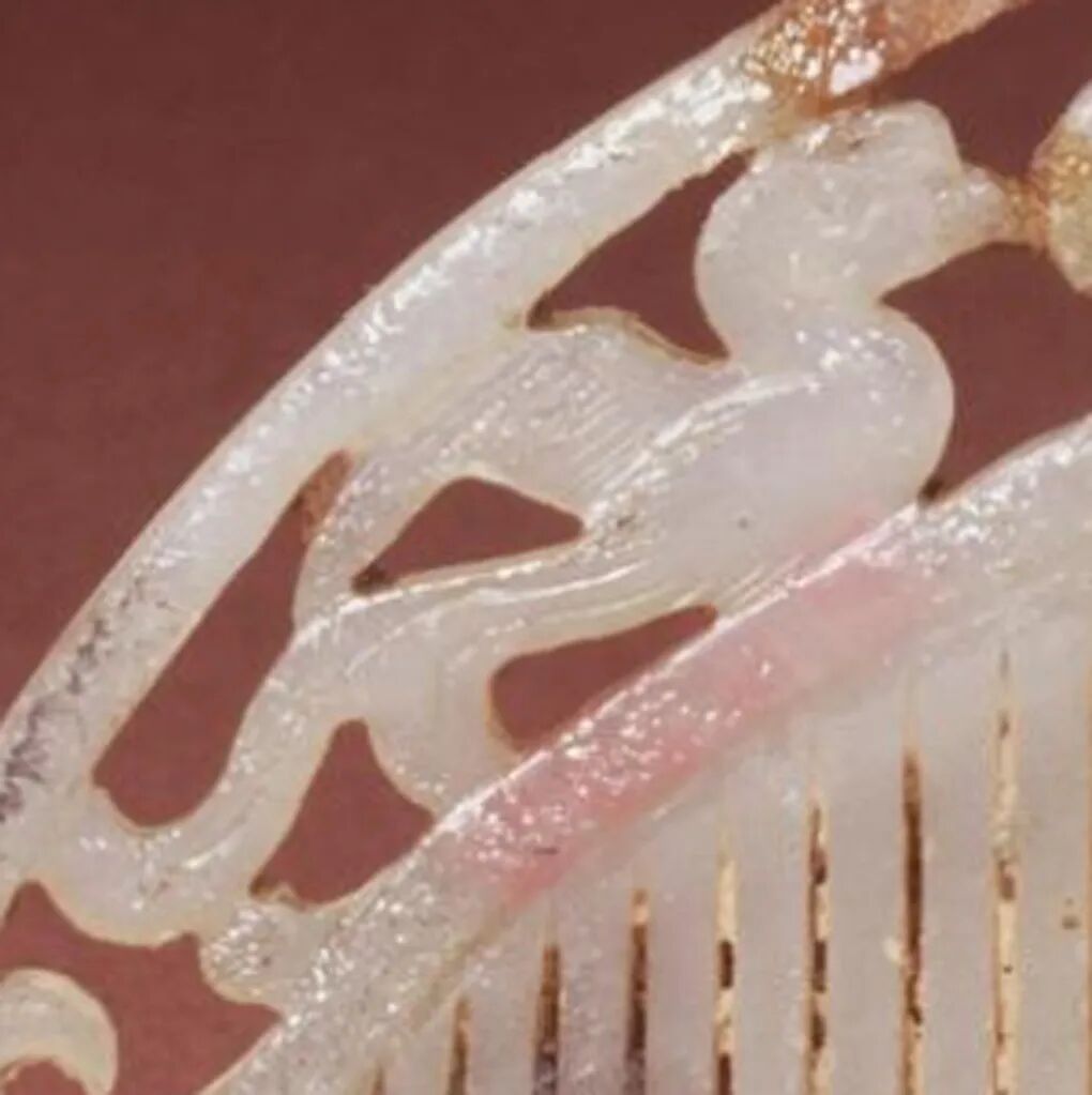 大家好!今天给大家介绍,唐代文物《玉花鸟纹梳》,长10.5厘米,宽3.5厘米,厚0.4厘米。