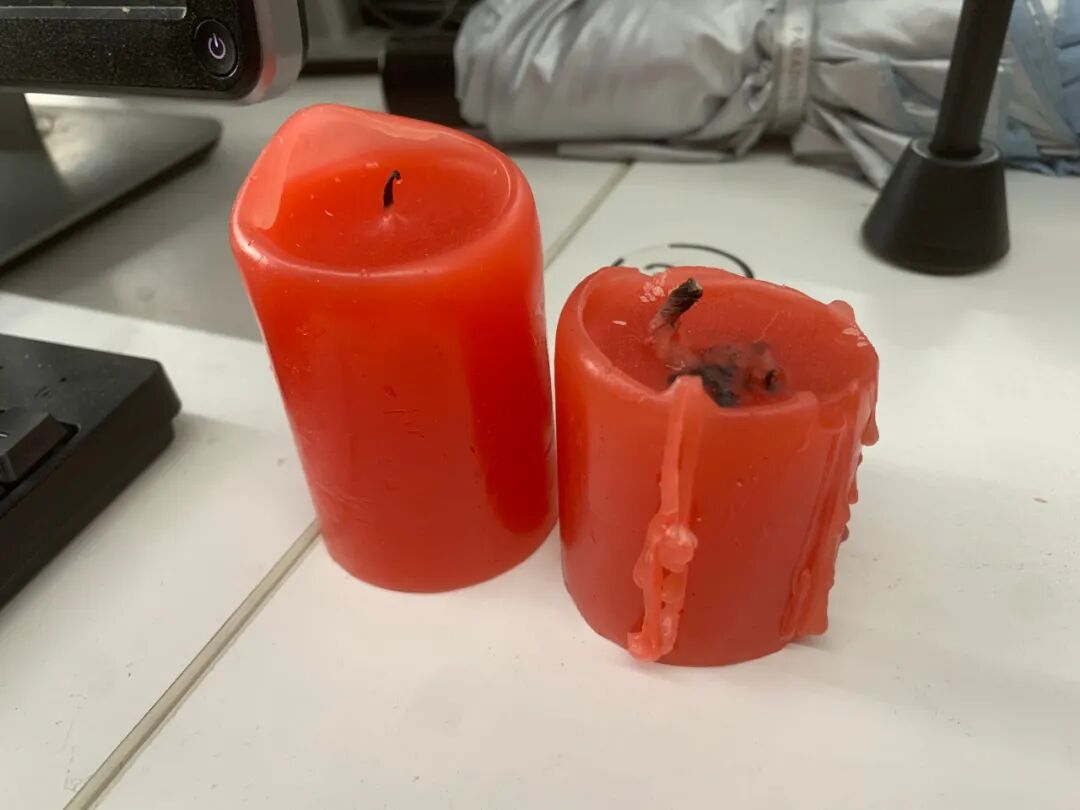 当然了难点远远不止这几个,蜡烛的制作也是很头疼的,我们搞了很久难以还原真实的感觉,索性直接买了两根大蜡烛,烧了一天一宿终于烧成了我们想要的样子
