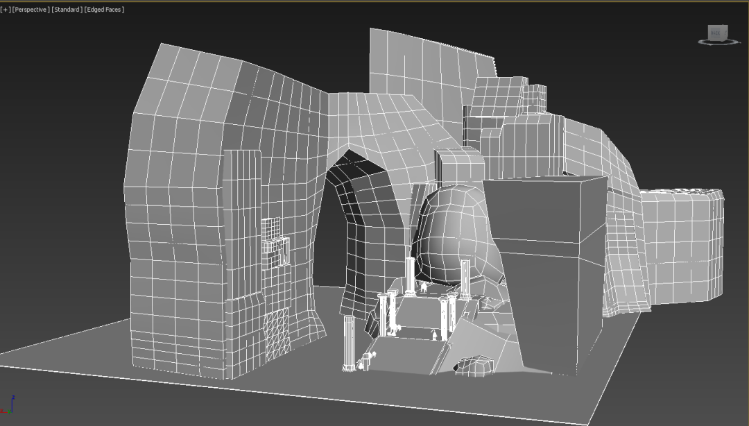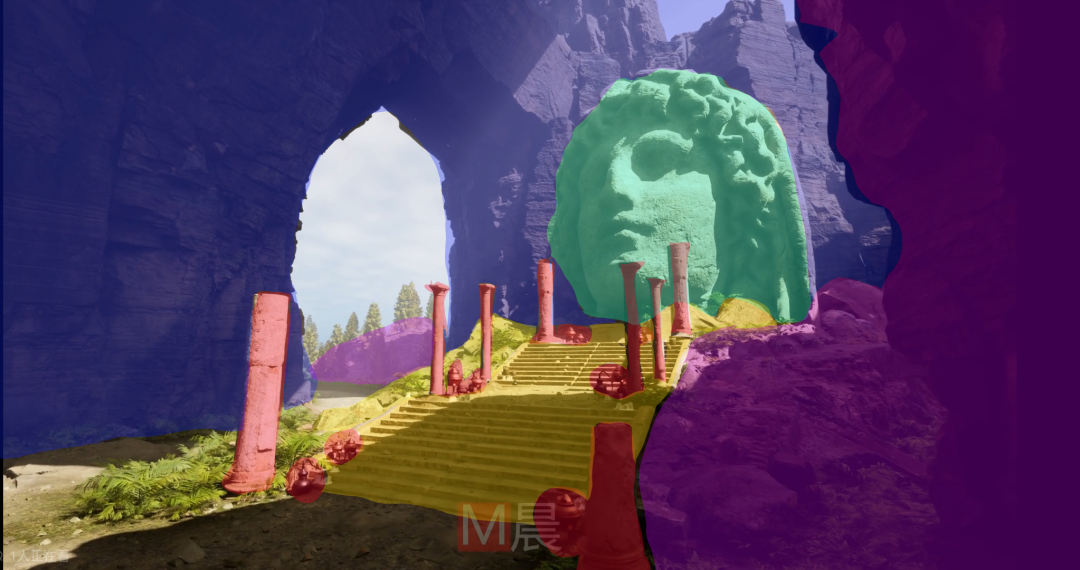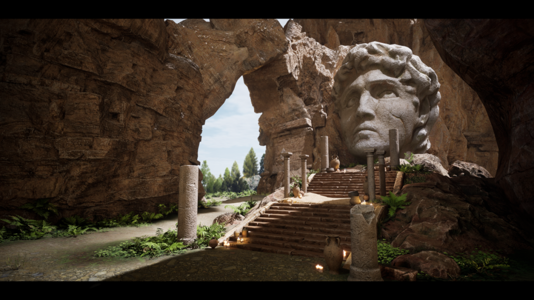 为了保证分工合作的同时依然能做到整体比例的统一,前期需要先根据原画把大致的形状比例与物品摆放位置确定,之后我们进行了工作分配,整个场景分为5个部分(大卫头,远处山体,楼梯和地台,柱子和饰品,背景山和近处石头以及近处的被遮挡的山体)