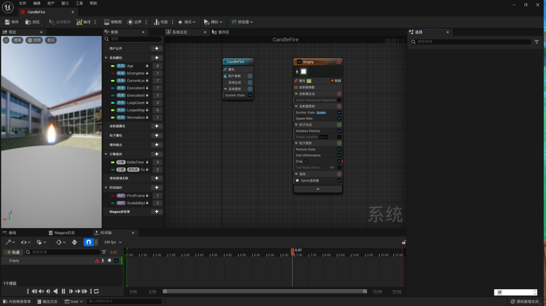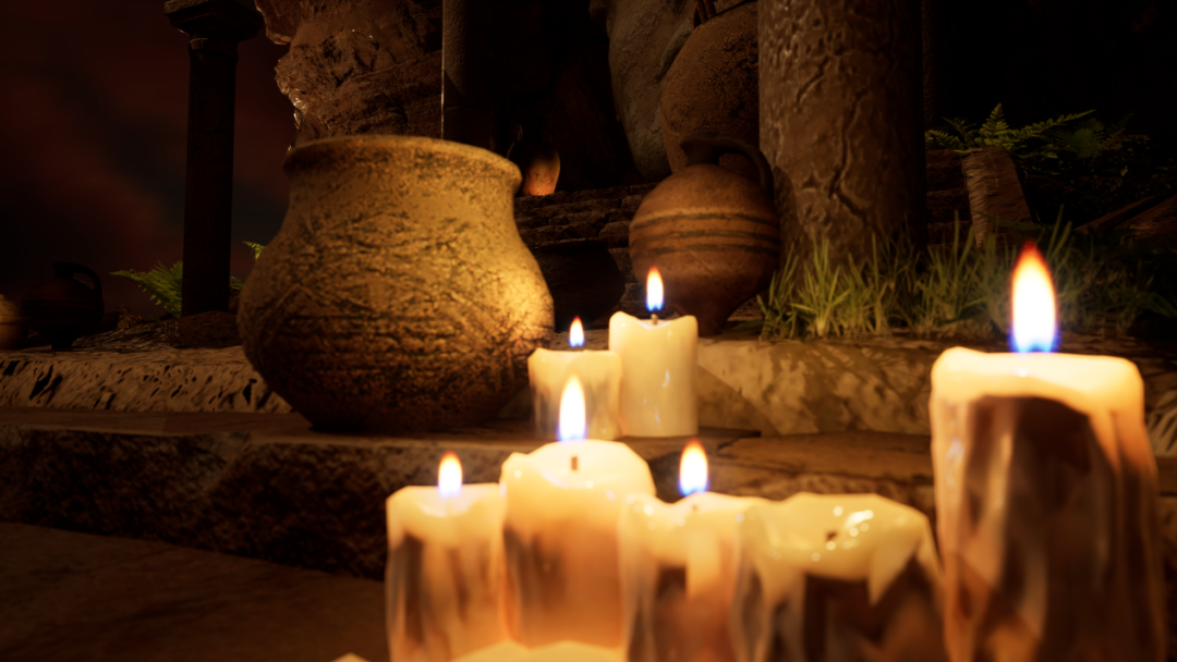 蜡烛的制作也是一个难点,我们为了实现蜡烛的烛火与火光窜动的效果,选择使用了Niagara粒子系统来制作,为了这个烛火可以说我们又加班了好几天,才研究出来这样一个比较基础的效果