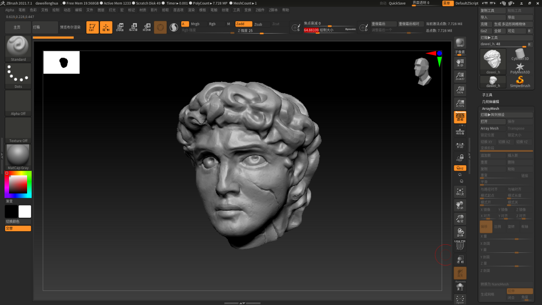 制作大卫的时候,因为是第一次雕刻人物,光是一个嘴唇就进行了无数次修改,可能前一秒还是阳刚猛男,后一秒就是窈窕淑女,不得不说人物面部的雕刻确实是这个场景的难点之一,一点细微的改变,就会造成整体比例的失调,曾经一度看着自己雕的丑脸想要放弃,但是好在经过老师的指导和无数次修改,终于稍稍还原了一丢丢米开朗琪罗的大卫像的感觉
