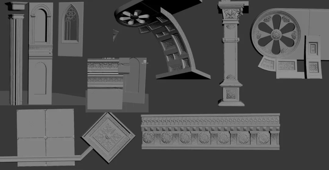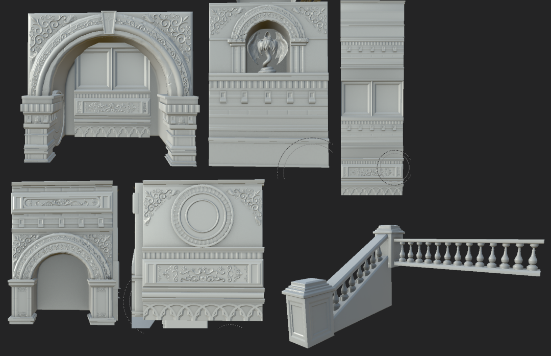 道具部分:场景道具包括三尊雕像,长枪若干,椅子,烛台等等,其中雕像、椅子、罗马柱等道具都进行了ZBrush雕刻。