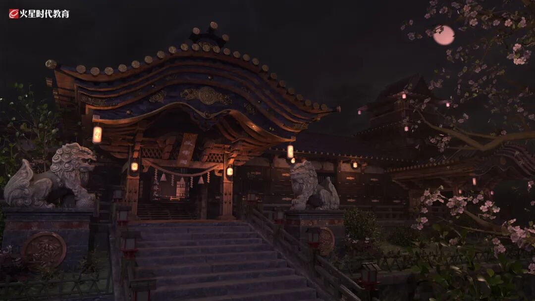 (2)前方台阶道具部分:负责部分主要是门口的石头台阶,场景道具包括灯笼,草丛,树木,屋内的武士刀,扶手等,道具种类比较复杂,并且需要进行花纹的雕刻。