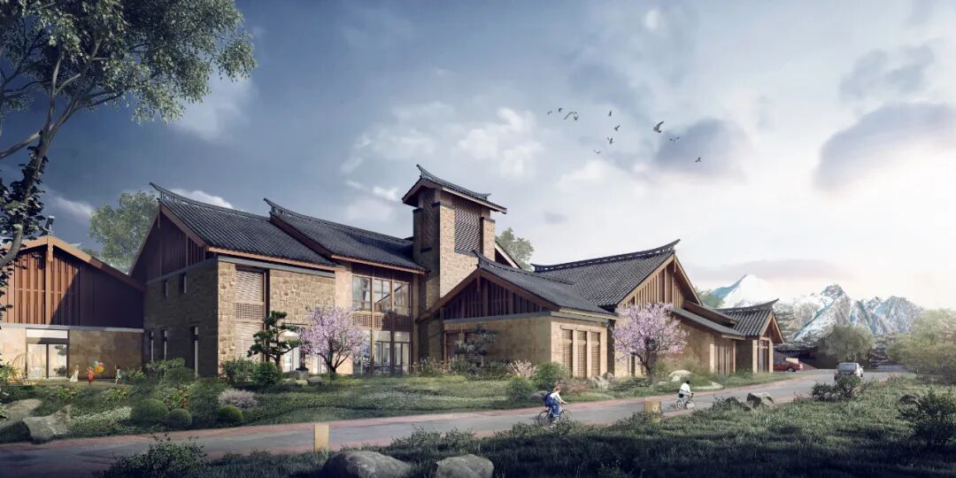 设计以一条南北向贯穿的主街形成建筑群与雪山之间的视觉通廊,恰如其分地融入了这座城市“雪山——白沙古镇——束河古镇——黑龙潭——丽江古城”的南北主轴线。