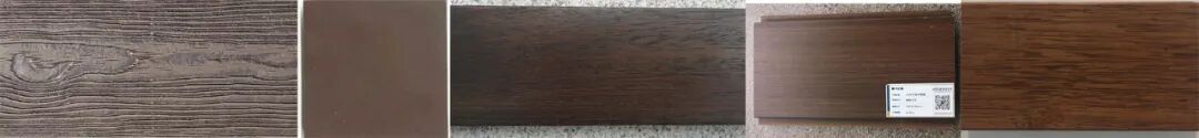 从左到右依次是栗子色水泥板、栗子色GRC、防腐木、浅棕色人造木、浅棕色实木