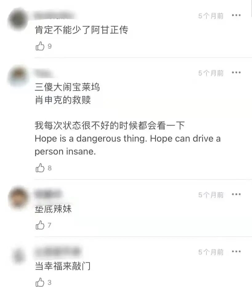 而网友的推荐被国外电影刷屏。在类似“一生必看的励志电影”盘点中,《追梦赤子心》《阿甘正传》《肖申克的救赎》《光荣之路》《风雨哈佛路》皆为常客。
