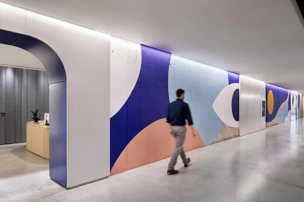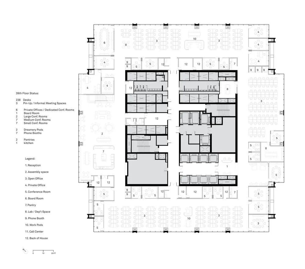 设计以部门为单位组建工作“社区”,并沿着建筑外窗布局。设计团队在方形建筑平面的中央核心区巧妙规划环境导向设计:原始的混凝土墙面上绘制的图形标记出东、西方向;而半透明的会议室所在处则代表了南、北方向。较大的会议室位于四个角落布置,以支持就近团队的便利使用。