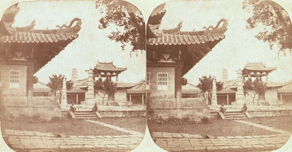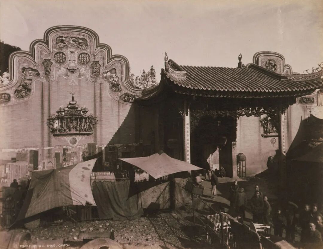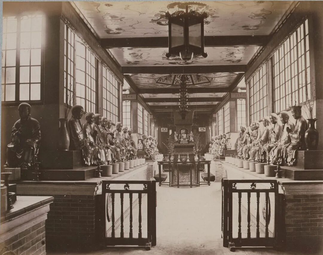 在当时摄影师眼中,宗教特征比较明显的寺庙当然也存在。当外国摄影师看到那些佛像、观音像、罗汉像时,显然还是知道他们所代表的“神像”意义的(许多摄影师就用这个词进行笼统称呼)。广州华林寺的五百罗汉堂,就因为显著的佛教特征、规模宏大的五百罗汉塑像而被多个摄影师慕名拍摄,甚至一些照片角度都完全一致。
