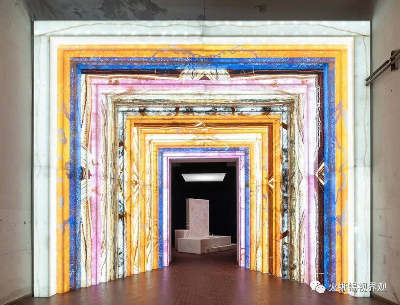 天然石材品牌SolidNature首次亮相米兰设计周,在Alcova展出了令人印象深刻的装置作品,通过一个由知名建筑团体OMA设计的发光的入口欢迎游客,该入口由9种不同类型的缟玛瑙按顺序组装而成。穿过这个入口,人们后来看到了荷兰设计师Sabine Marcelis设计的粉色淡色调缟玛瑙整体浴室雕塑;以及OMA设计的多功能橱柜和床。
