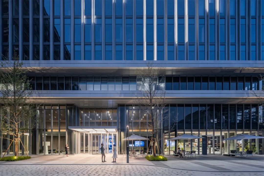 对于较高的楼层,建筑师取“云”之意向,选择了一种看起来更为平静的外立面。“云”的外观被抽象化,由不断重复的垂直元素定义,并采用利于通风的竖向穿孔铝板构件实现,把功能和视觉元素有效结合。其中两栋办公楼,在楼腰处利用一个体量的错位与推移设计,嵌入了“玻璃盒”般的楼层体块,它们将高层建筑一分为二,在立面上形成有意思的变化,为内部空间带来更多的光源和开放性。而这个特殊的“玻璃盒”楼层,也为特定需求的办公租户提供了“非标型”的场地选择,这里更适合开敞型办公、产品展示、展览、举办活动等。