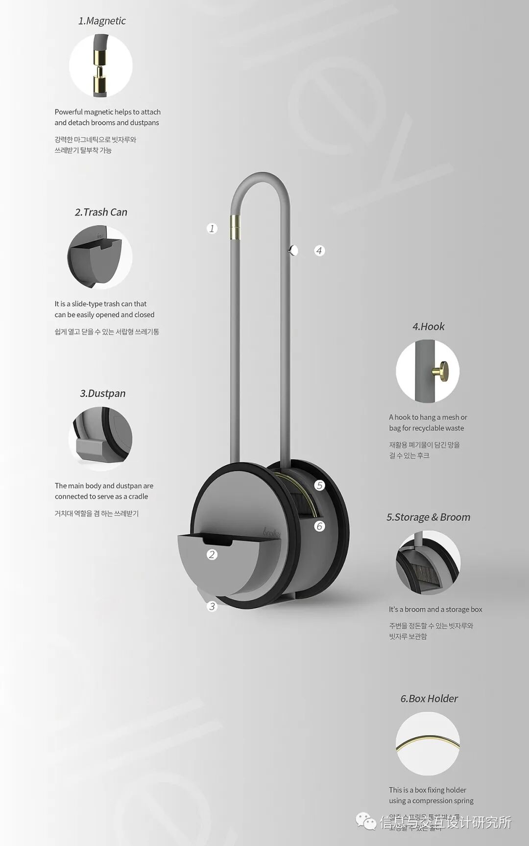 像网袋或布袋这样的杂物可以挂在 Brolley 的内置挂钩上,也可以与收集在簸箕中的垃圾一起塞入隔间。通过一系列不同颜色的概念化,Choi 认为 Brolley 可以融入任何现代家庭。