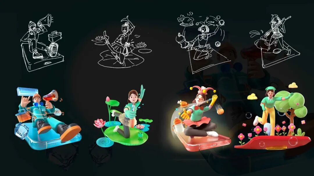 空间有限的头图在氛围营造上肯定是受局限的,那么如何解决呢?首先为了不影响人物细节的展示,人物造型尽量采用半身的坐、跪等姿势,让人物尽可能放大。透视上采用畸变大透视,加以向前冲的动画效果,和物体漂浮感的呈现,整体给人更强的视觉冲击力。