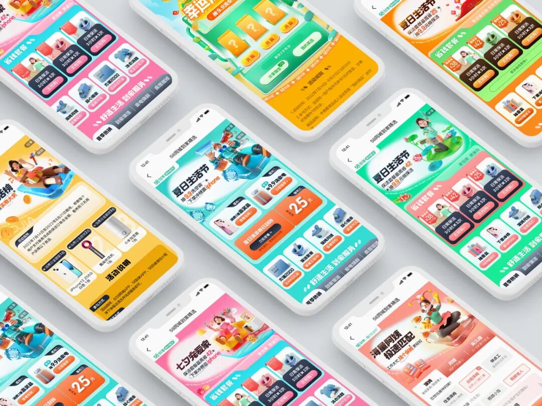 上半年,设计团队为58到家建立了一套完整的设计语言,确定了“品质生活”的设计愿景,在产品功能设计和活动运营设计中,持续输出这一概念。经过项目组脑爆,我们确定了此次活动的设计关键词为:夏日,清爽,多彩,品质生活,特别个性化表达了“品质生活”的概念——“艺术生活”,进而精确了设计目标为:缤纷夏日,艺术生活。希望能通过系列感的设计表达,呈现给用户愉悦美好的购物体验,加深“品质生活”的感知。