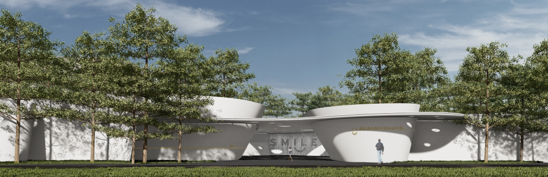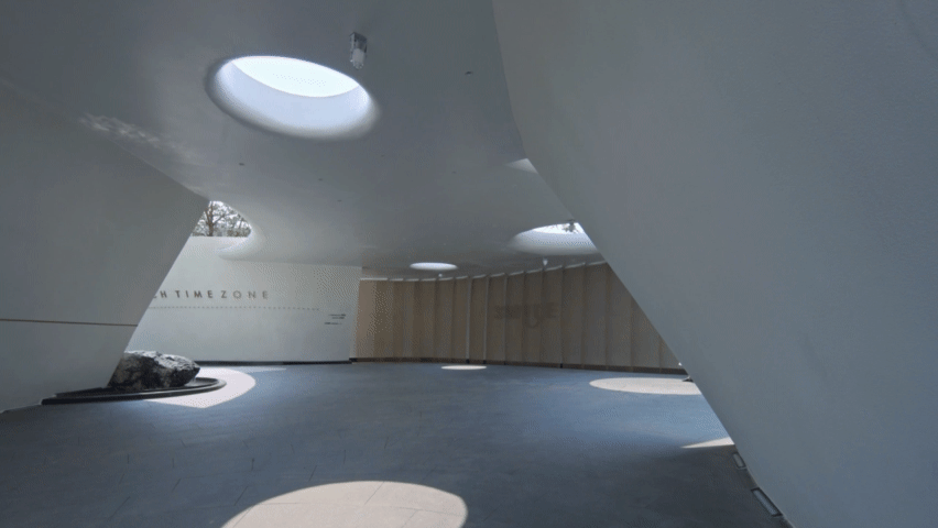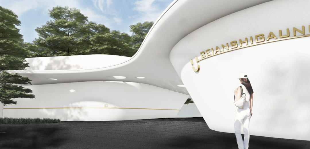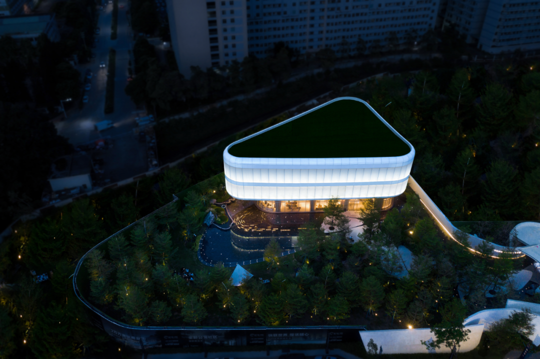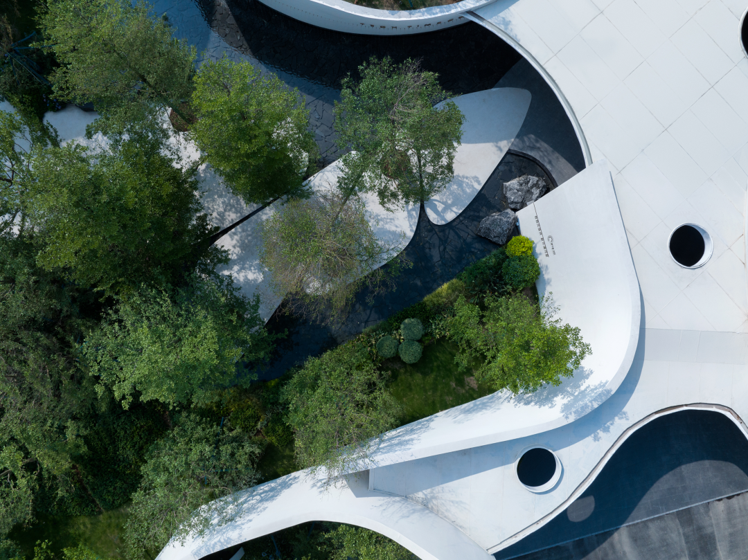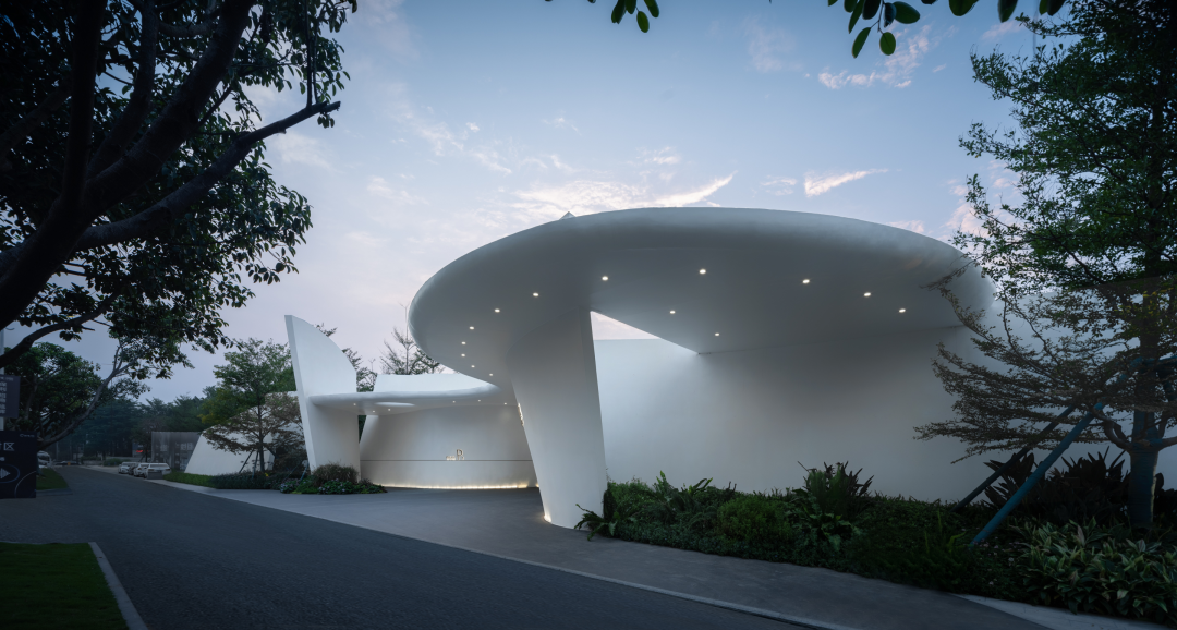 风景门厅以流线型的墙体与浮顶构成云岛状造型,纯白的材质对外展现着出尘夺目的效果,与林木交映,柔和而明确地激活现状城市环境的平淡,宣示内部领域的气质。
