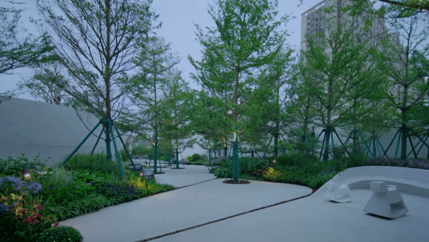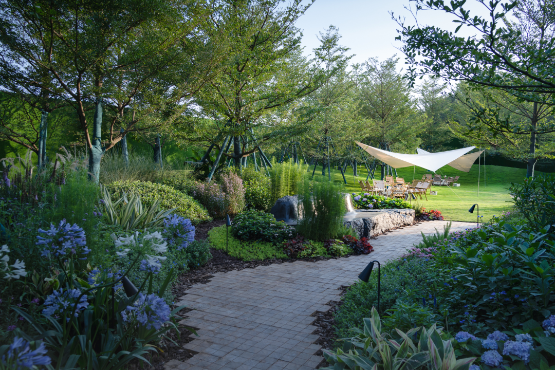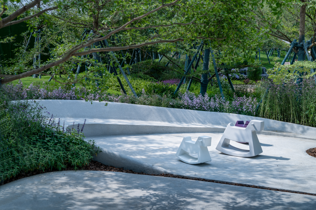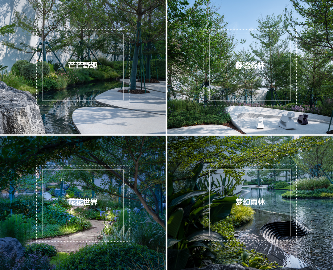 我们首先以一个统一的手法围合场域空间,屏蔽嘈杂的外部环境,形成内向风景、外展界面的布局。由此,内部森系花境的生活沉浸式风景可以纯粹地浮现。
