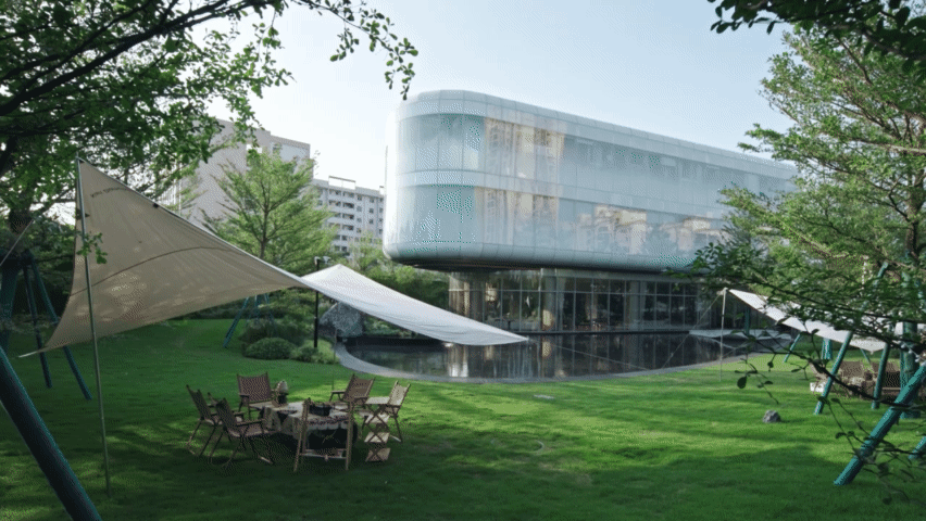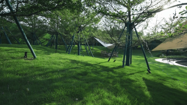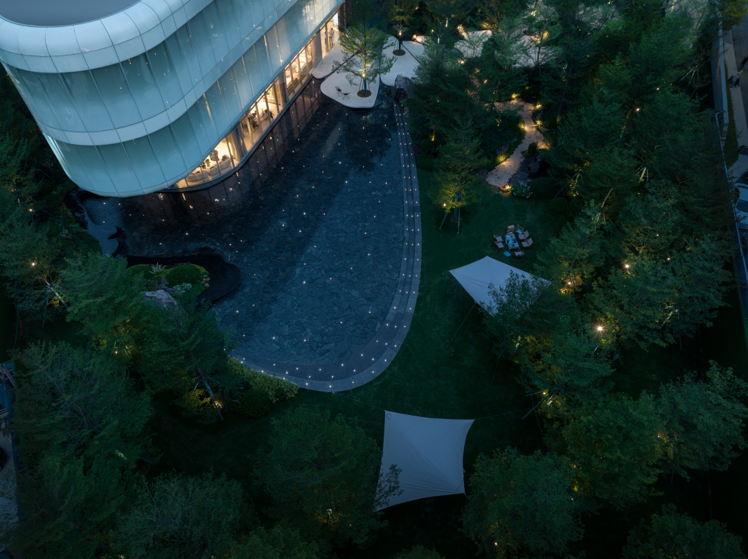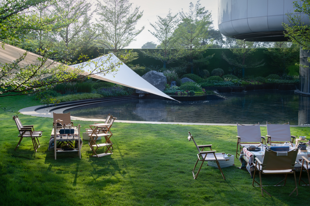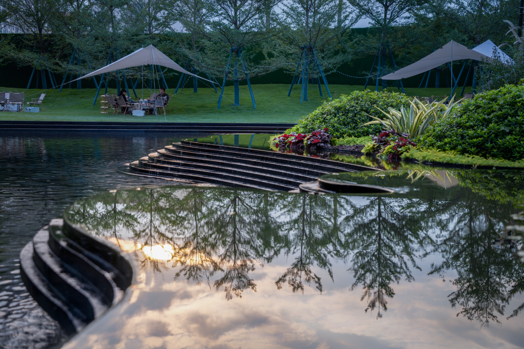 草坡上的露营篷帐、池水中的星光涟漪与室内的聚谈轻语,交织出隐于城市车水马龙之外悠然氛围,于悠然中静静品味闲适的生活。