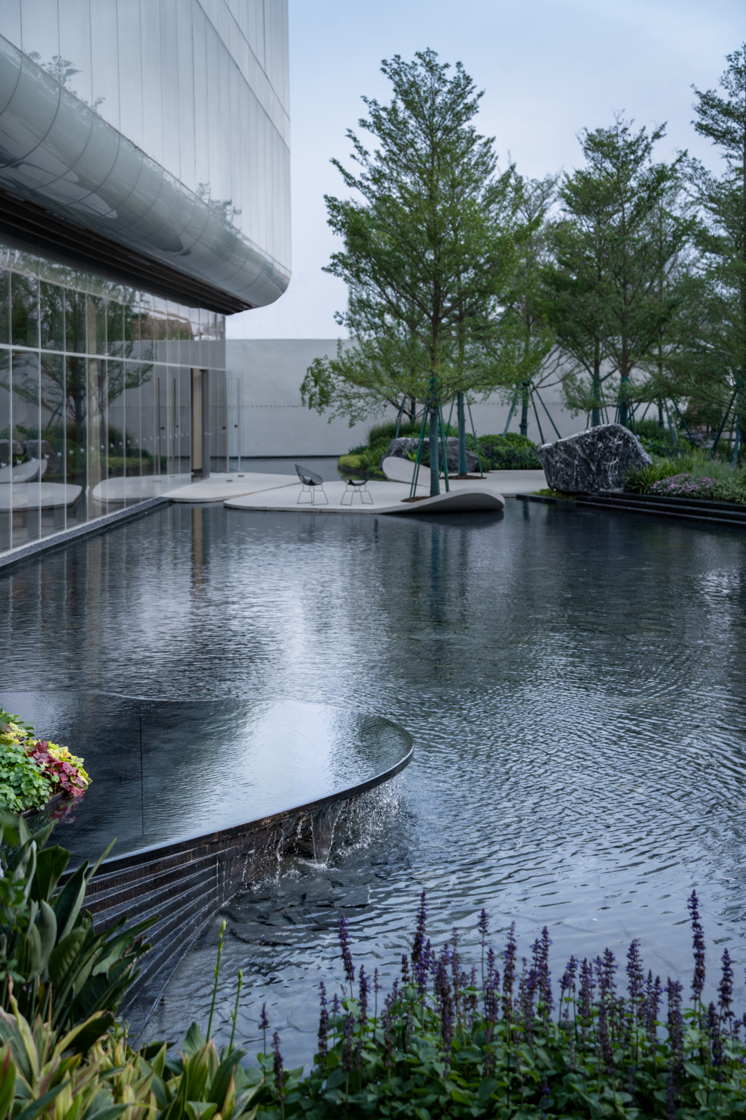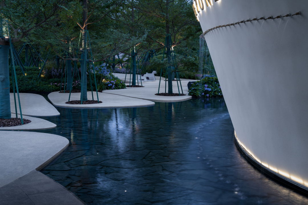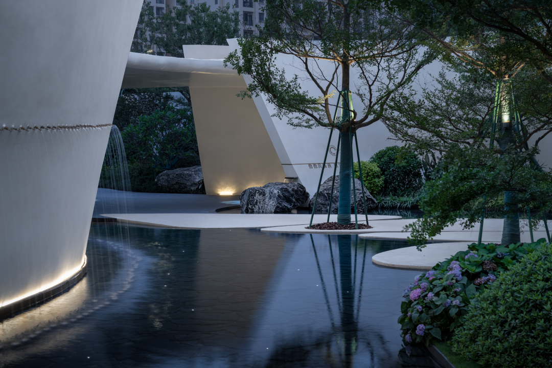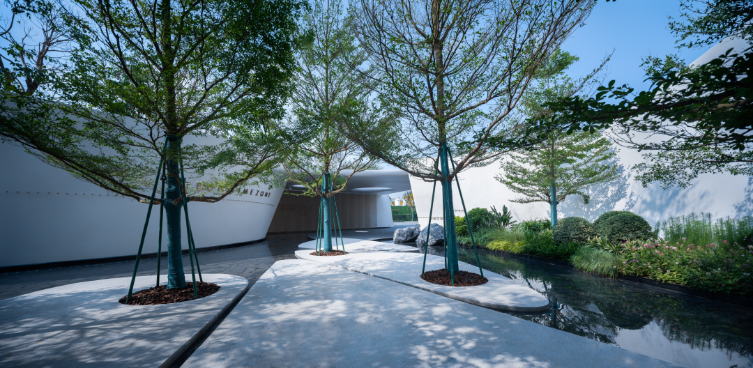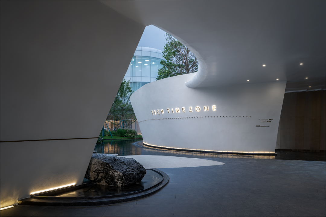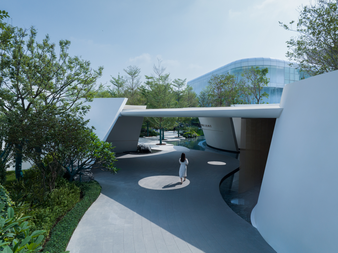 风景门厅以流线型的墙体、浮顶构成云岛状造型共同展示出科技的时空感。存粹的色彩及铺装、小品的造型、苗木整体形态的刻画,都体现了设计师深厚的设计功底。