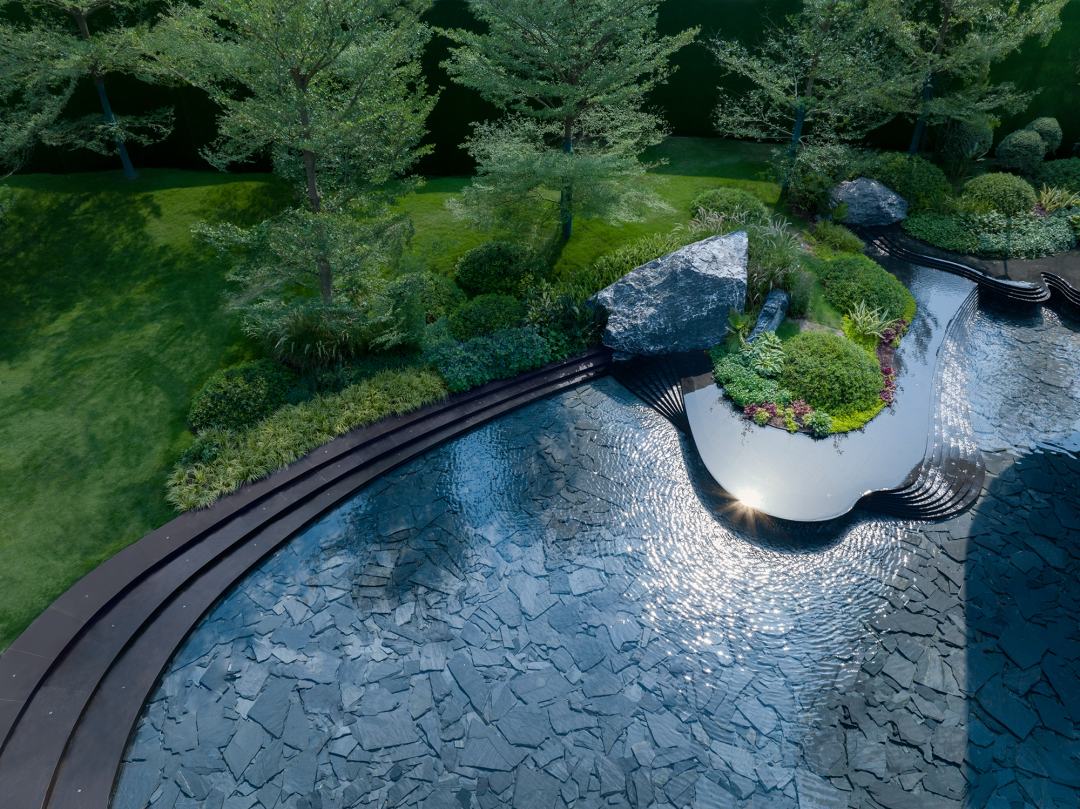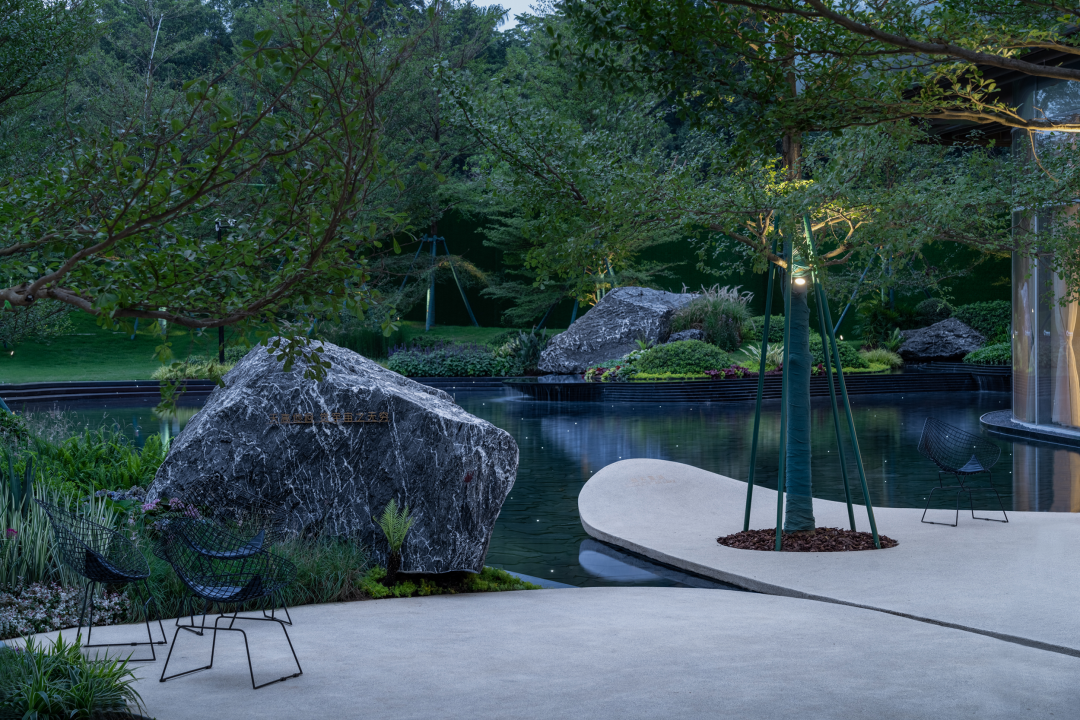 溪流汇入到主体建筑窗前,扩展为幽静的星池,池畔一坡草坪与建筑室内对景互望,共同奉上气质相同的室内外休闲生活。
