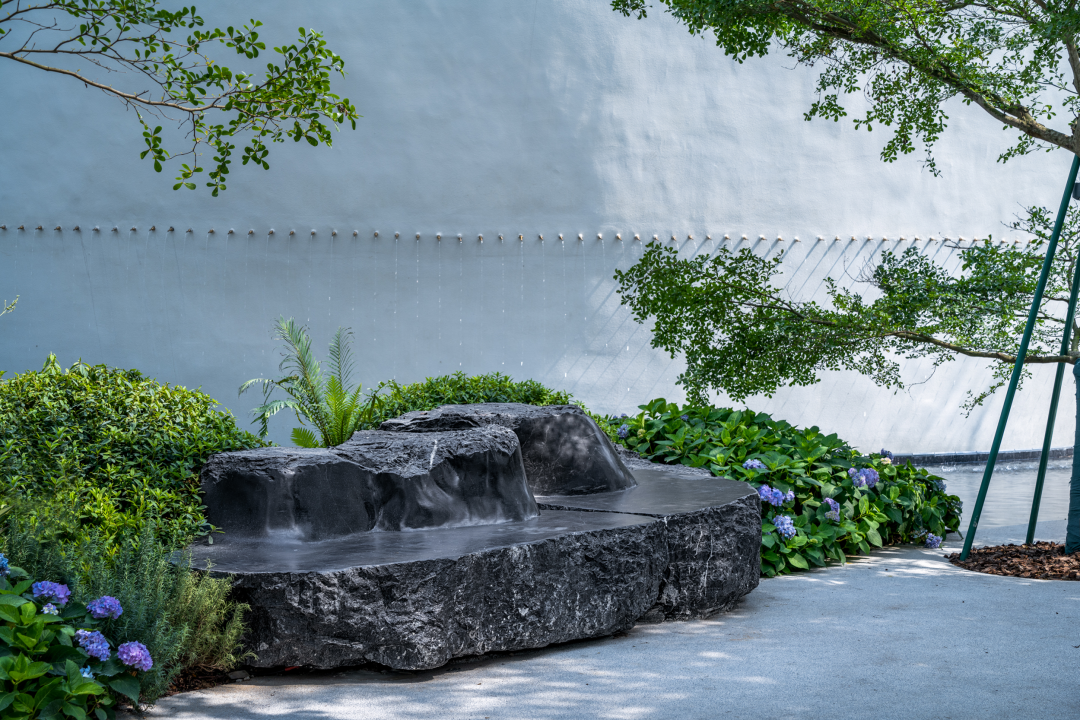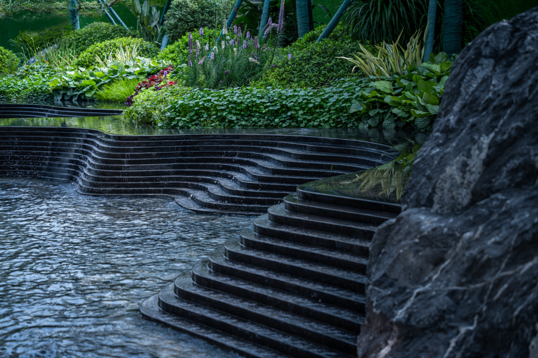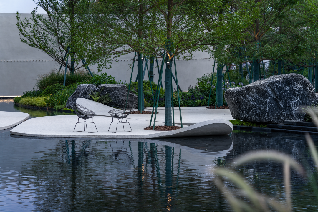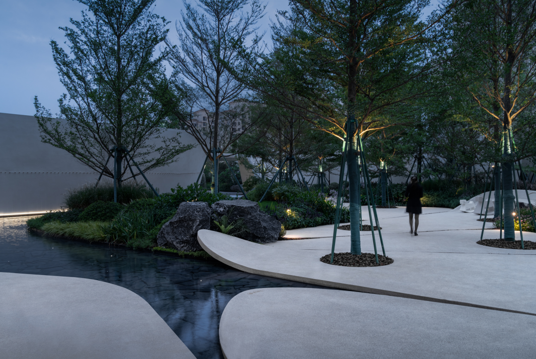 不同于城市界面的出尘气质,这里气氛更加放松,林荫之间花木扶疏摇曳,与树影共映在水溪的波光中。