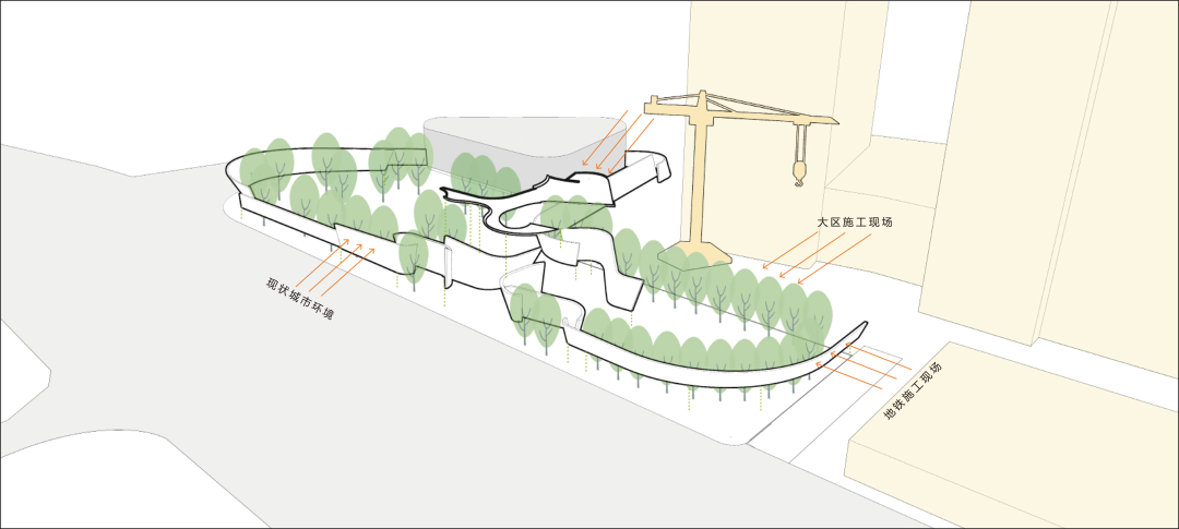 项目周边现状以居民区与厂房区为主,呈现常态网格布局;城市硬质空间占比较高,设施相对陈旧,缺乏城市风景场域与特色;且临近地铁施工现场。