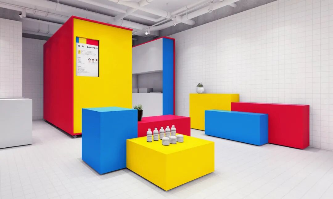 EASYFAST is a chain of convenience photography shops, operating in a small area (probably less than ten square meters). It is unique in its "scale" and "speed" : small volume of business, fast recognition. In terms of visual orientation, we describe EASYFAST as colored gravel in the eye. EASYFAST always chooses to operate in the busiest or most complex environments, which means they are commercial Spaces with high density of logos. Due to EASYFAST's small footprint, using graphics as its identification is actually a risky approach. Therefore, we decided not to design a pattern as its logo. Instead, the entire space is designed to be recognizable like colored gravel blown into the eye. The whole store became a sign-recognition system. From this perspective, EASYFAST has the largest and most visible logo in a business environment.