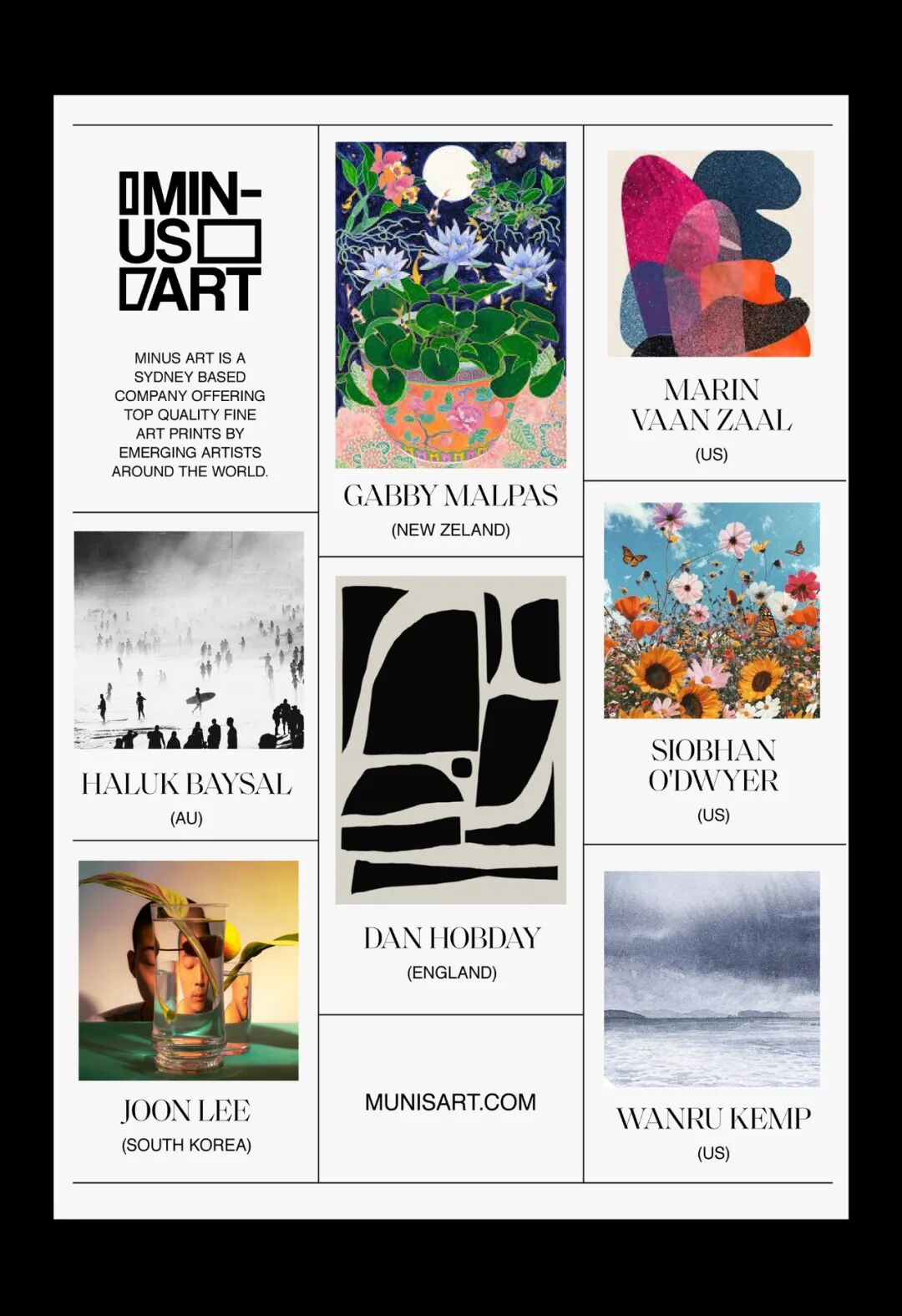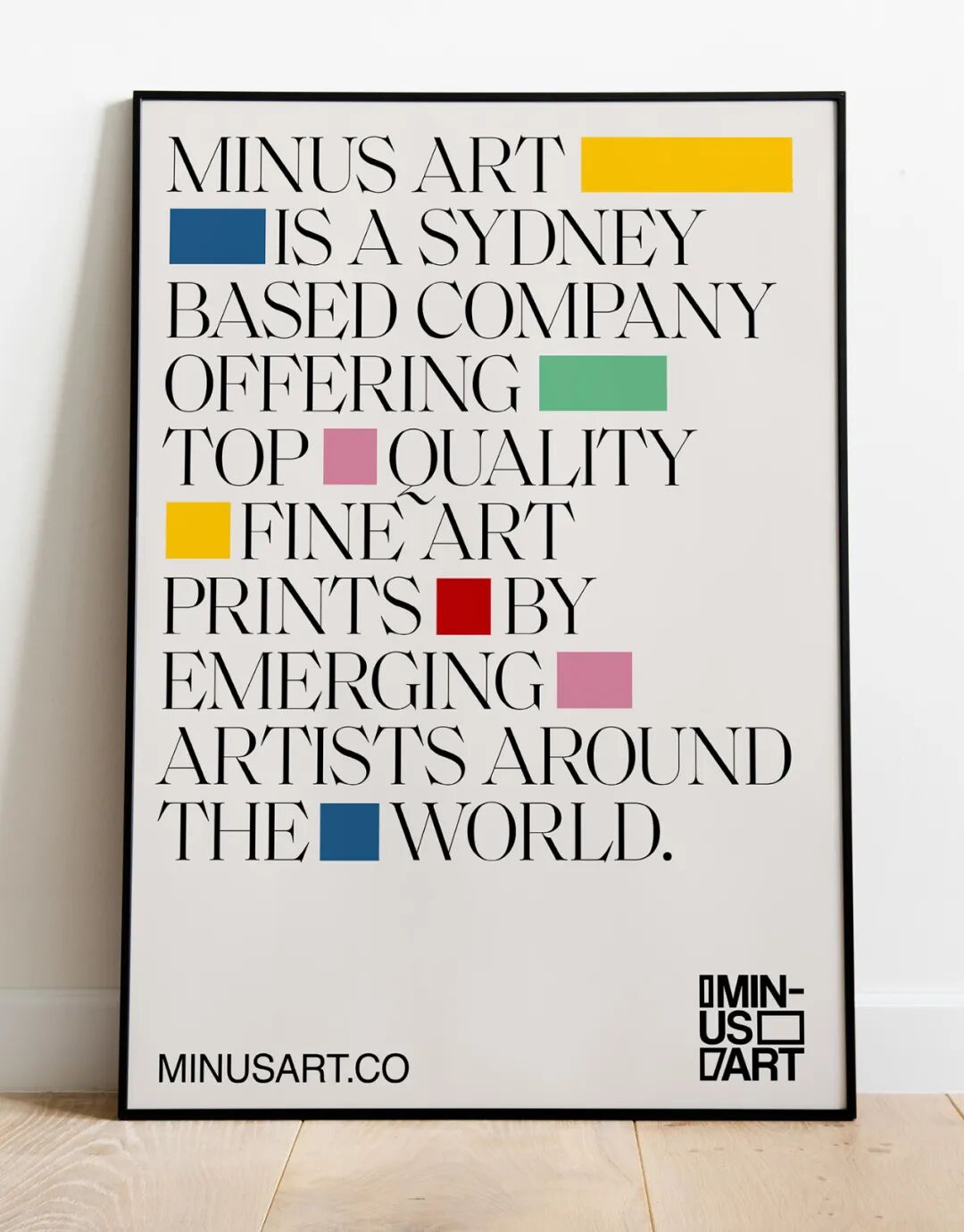 MINUS ART是一家位于悉尼的公司,提供高质量的产品世界各地新兴艺术家的精美艺术版画。色彩丰富,友好,减艺术传达简单。通过简单的形状(基于框架格式),它旨在突出多样性的想法,艺术家,框架和大小,因为减艺术适应你的地方,使它看起来像你想要的方式。这个方向涉及颜色、形状和排版处理。用很少的元素,原色和两种字体,我们创建了一个简单的引人注目和有影响力的设计,使减法艺术一个可识别的品牌。