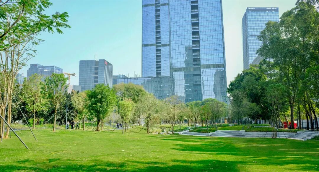 The garden in the high-tech park, winding cloud paths, undulating terrain, blue flower border and blue flower and trees reflect mutually. Waiting for the blooming time of flowers, the breeze is light, residents could feel the tranquility, leisure and calm state of mind, and heal their tired body and mind under the high-pressure work of urban people.