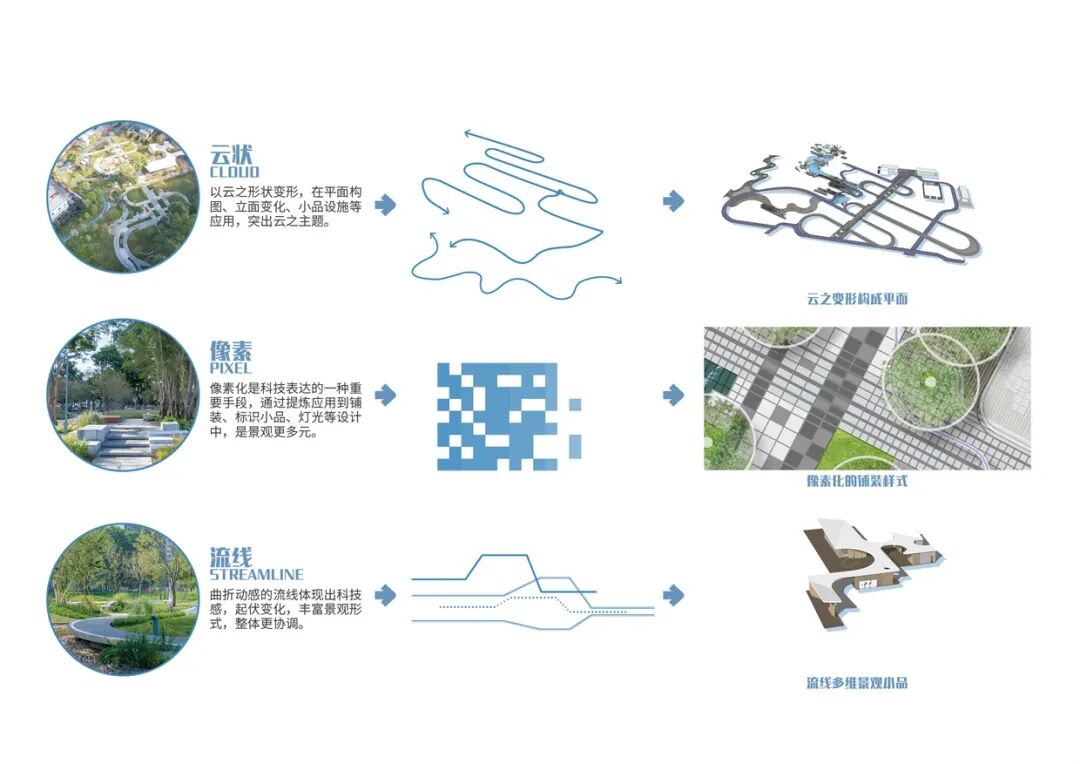 整体设计以抽象化“云”构图形成规则式与自然式空间耦合布局,色彩以高级灰为基调,点缀科技蓝、云朵白。城市界面规则强烈的视觉冲击感,带来科技时尚的云空间体验;往西渐入佳境,感受自然生态的活力云空间。结合人流交通分析,规划智见像素中轴为核心,通过丰富复杂的自然性与简单纯粹的几何性的交织交融,打开边界,建立公园与城市街道的可达性,营造人与科技、自然、城市和谐共处的全新现代空间场所,感怀时代之大爱与城市的美好,让原本灰色的场地转变为活化周边社区的公园。