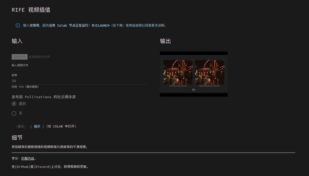 Pollinations.ai 平台可跳转至 colab 运行算法,在平台中打开会提供关键参数的控制效果教程。