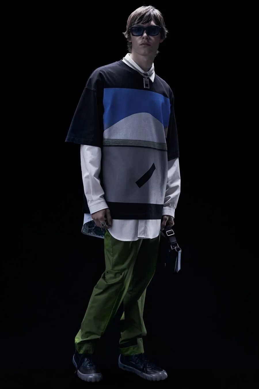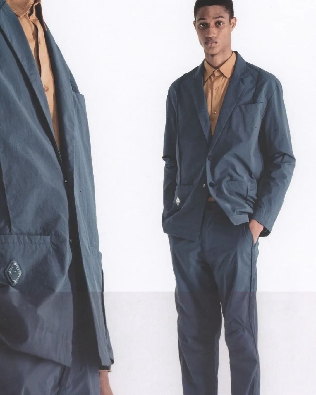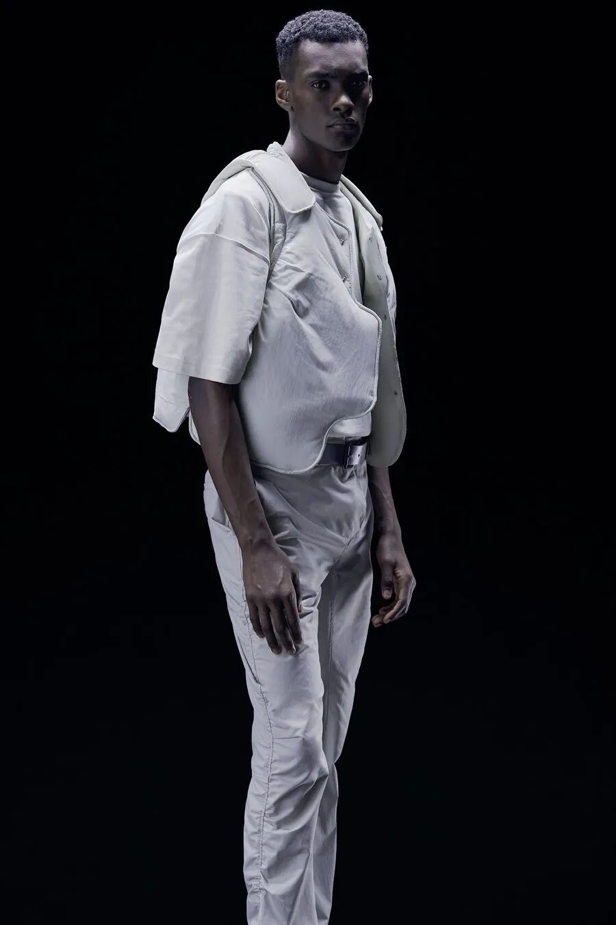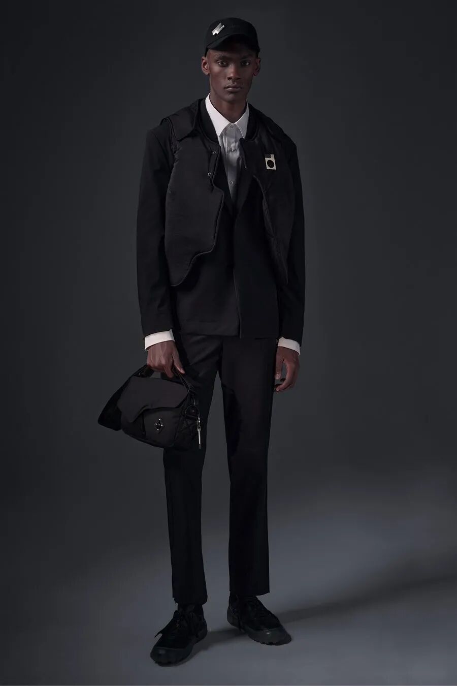 符合人体工程学的护甲/背带、无领衬衫、褶皱的夹克、带有拼接的针织衫…工业风混合着时尚的高级质感,都让人们看出了Samuel Ross对20世纪西装的经典剪影的致敬。