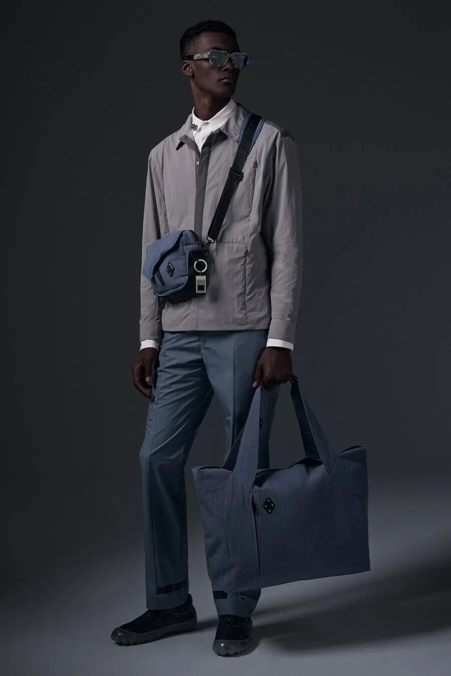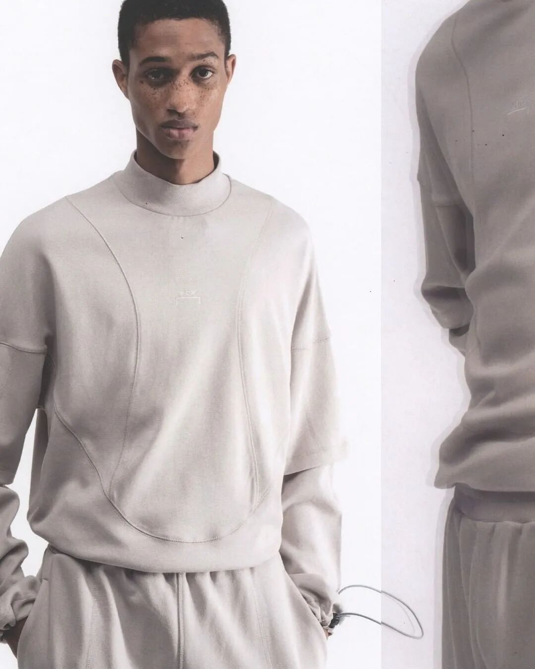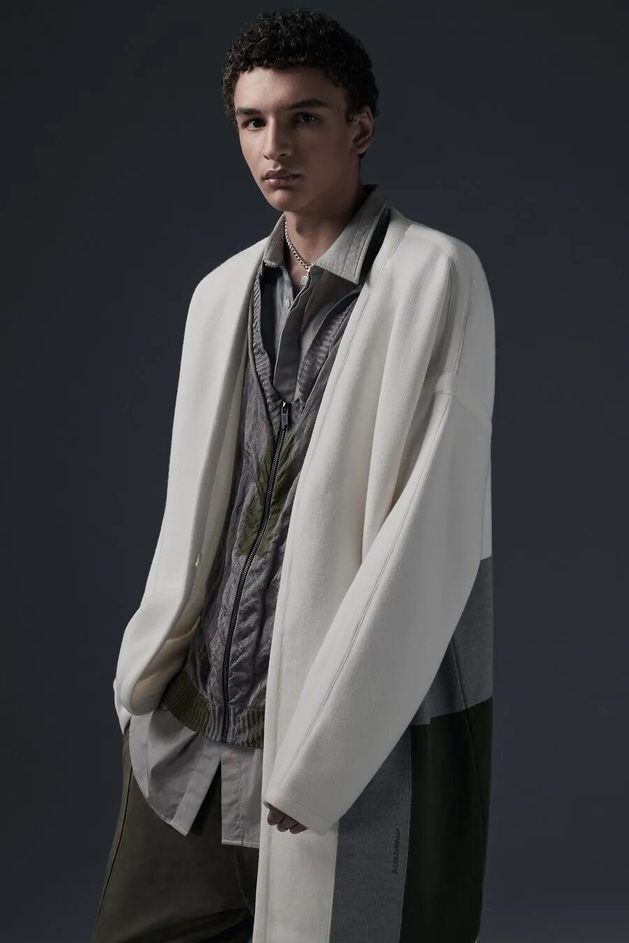 符合人体工程学的护甲/背带、无领衬衫、褶皱的夹克、带有拼接的针织衫…工业风混合着时尚的高级质感,都让人们看出了Samuel Ross对20世纪西装的经典剪影的致敬。