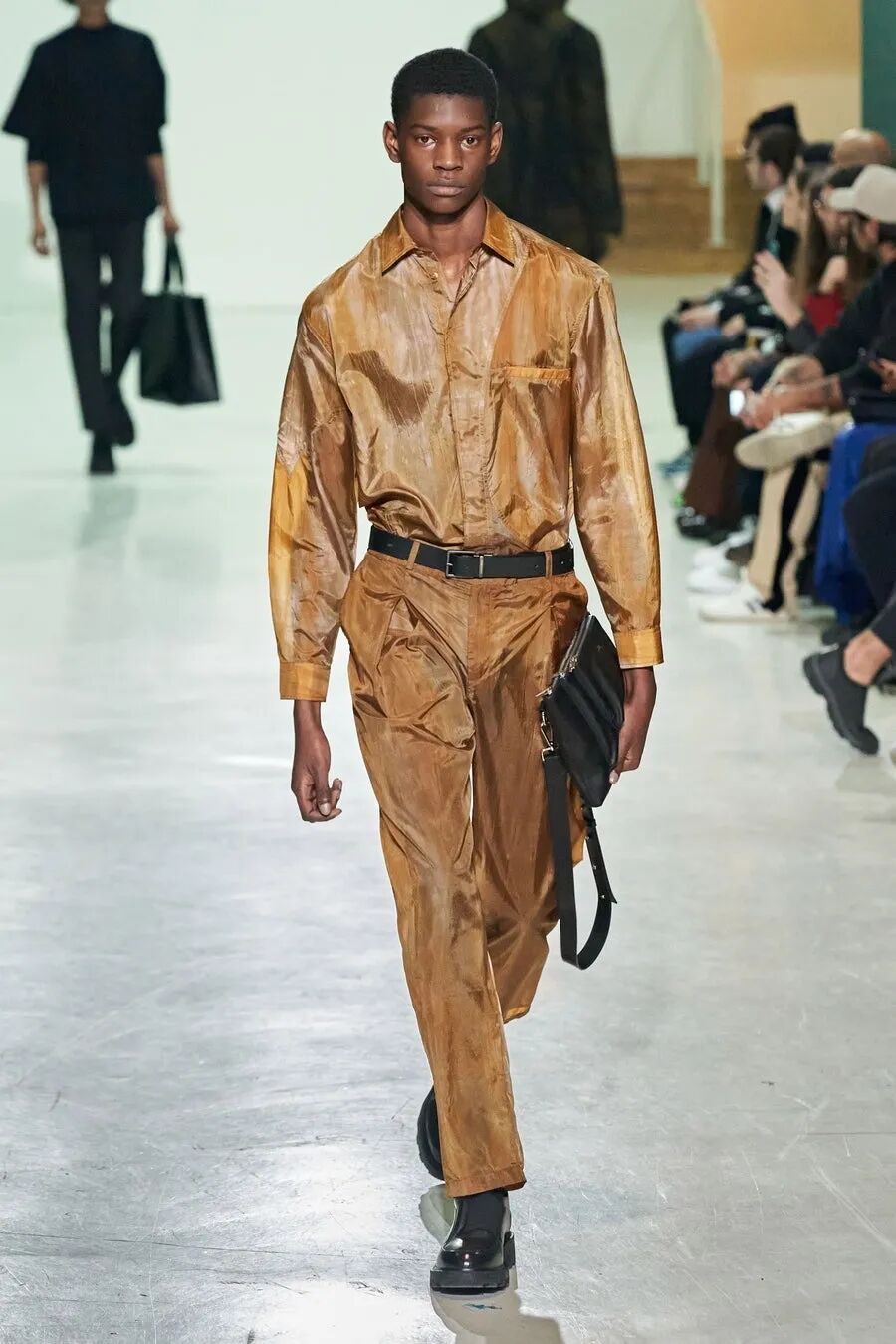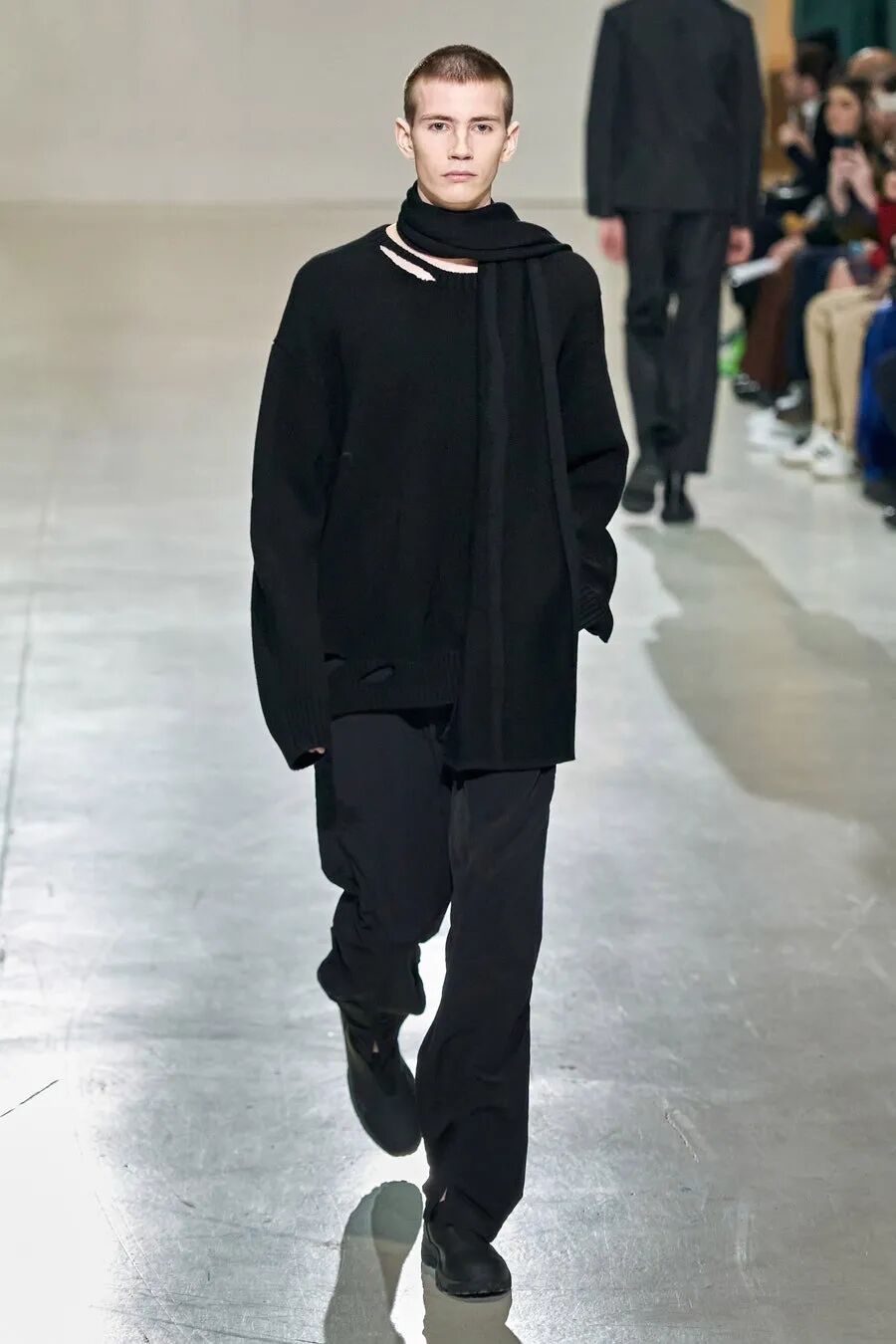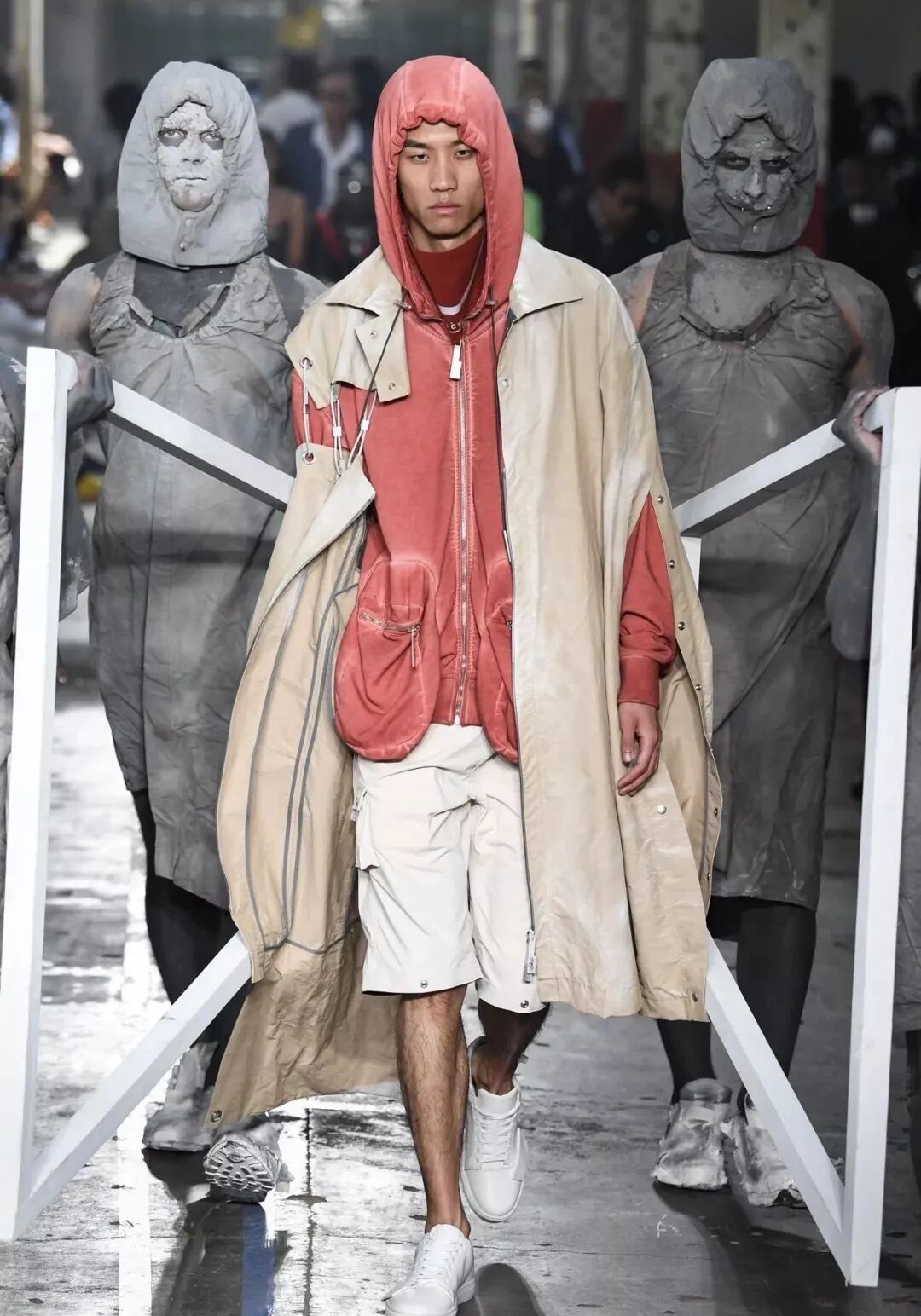 你还能在Samuel Ross的秀场中看到钢架支撑起的装饰、精致在新衣服上的墙灰、剑走偏锋的金属装饰…这些带有工人阶级色彩的元素在Samuel Ross的设计下,透露着时尚赋予的高级。