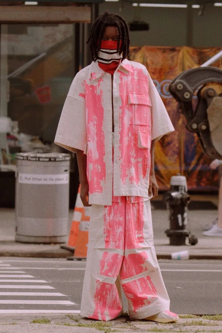 居家隔离丝毫没有阻碍创意总监 Francesco Risso 大玩特玩的心情,他在窗帘、地毯、以及日常生活的方方面面中寻找灵感。他用分解的手法在拼接与重组寻找创新的时尚,拼接外套、两截式短裤、泳衣造型背心…