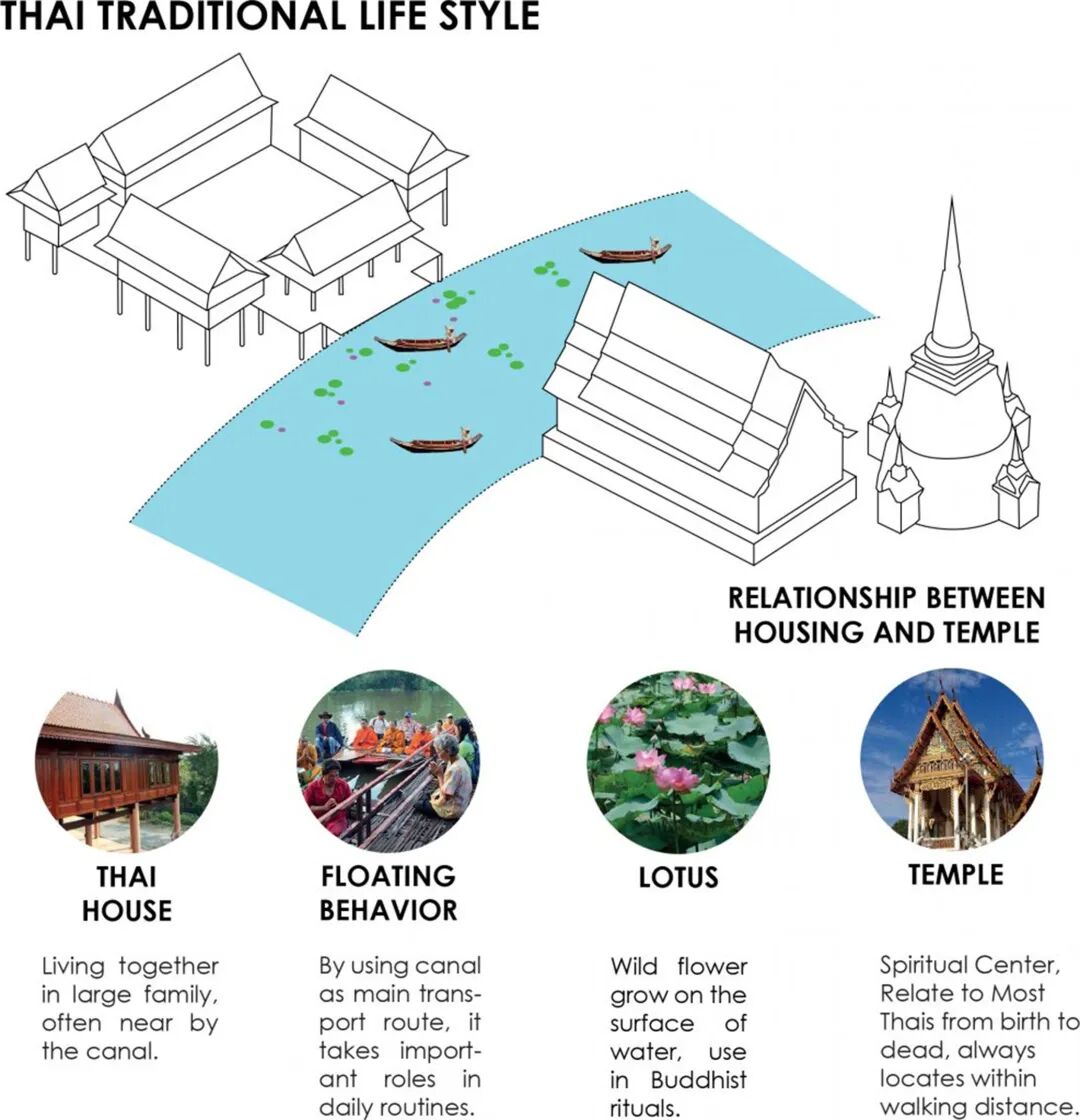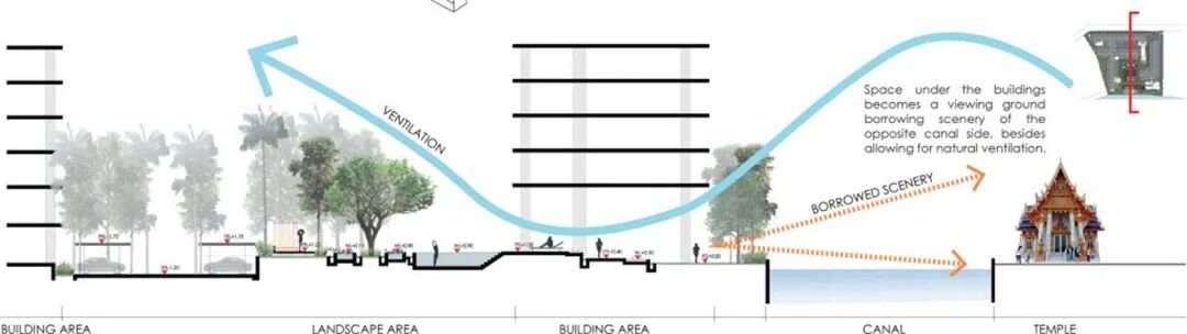 两座建筑成L型形成一个内部庭院,立面材料的灵感来自泰国传统房屋的图案和材料,浅色材料反射着阳光。而河岸边的建筑进行了抬高,让内部庭院和运河之间建立了联系。