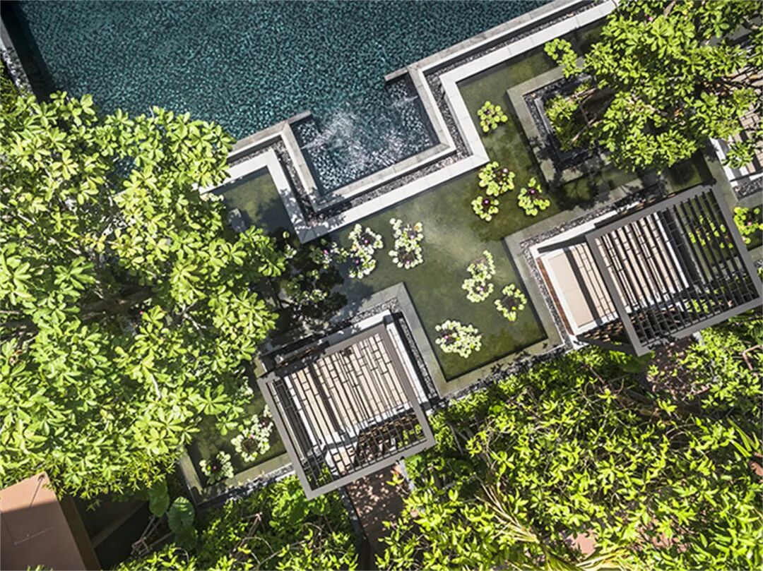 整个项目的中庭由泳池及睡莲池无缝连接组成,水上庭院以及木质平台横跨整个中庭空间,3座极简凉亭“浮”于水面,住户可以在此欣赏美景。