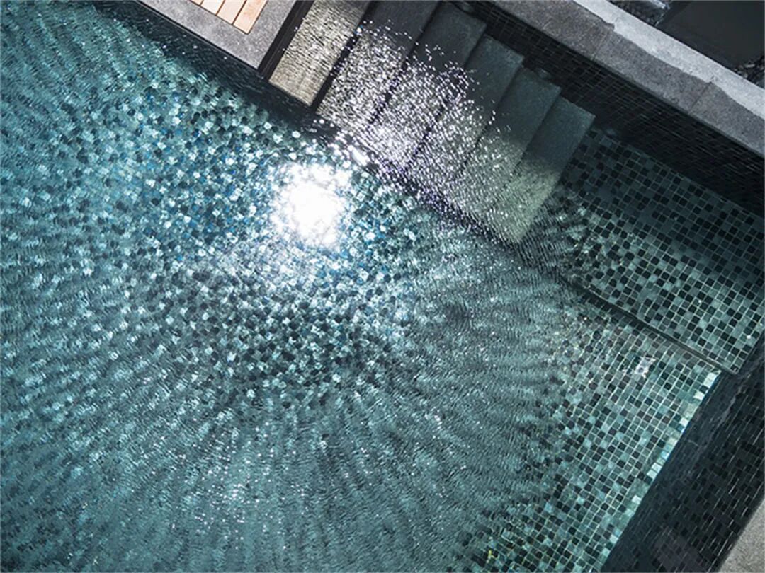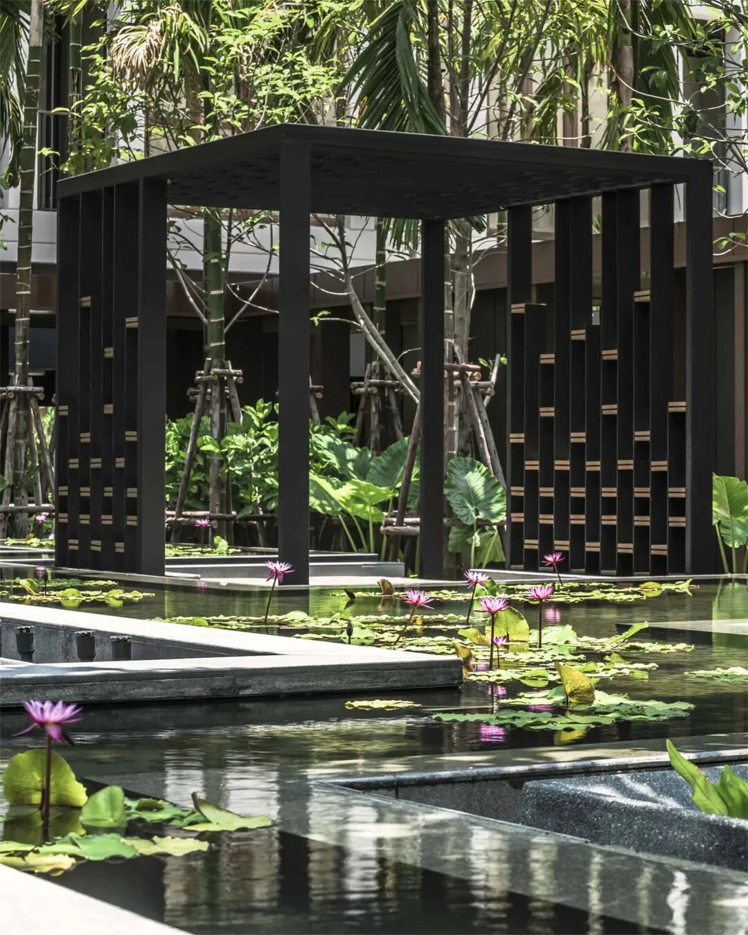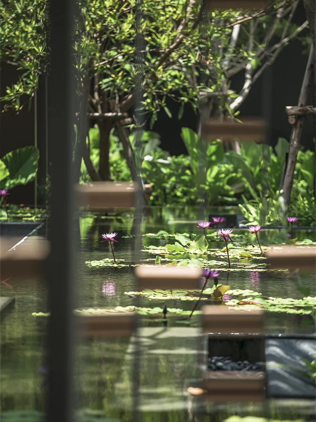 睡莲池是整个中庭空间的标志性景观,矩形的分割区域、静立在水中的方形树池、水从泳池边缘缓慢溢出、漂浮的睡莲等等,营造出宁静的氛围感。