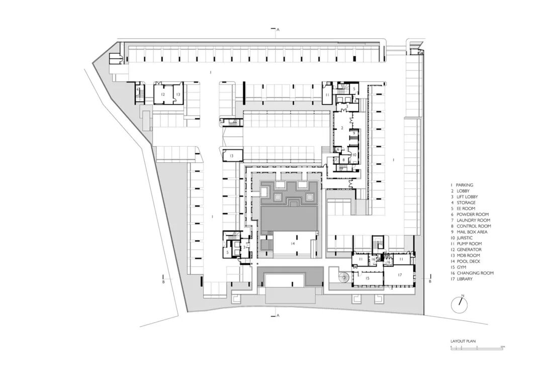 建筑架空层为住户创造了可渗透的底层,游泳池、花园和硬质景观,为住户的社交提供了更为丰富灵活的空间,同时也起到了通风等作用。