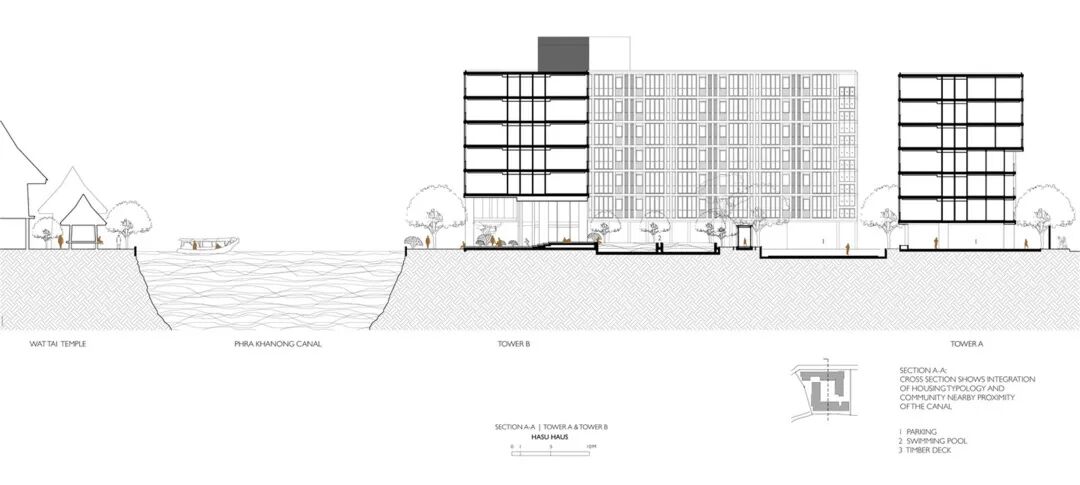 “Hasu Haus的设计旨在现代生活状态和更高密度的背景下重新诠释滨水的旧生活方式。”