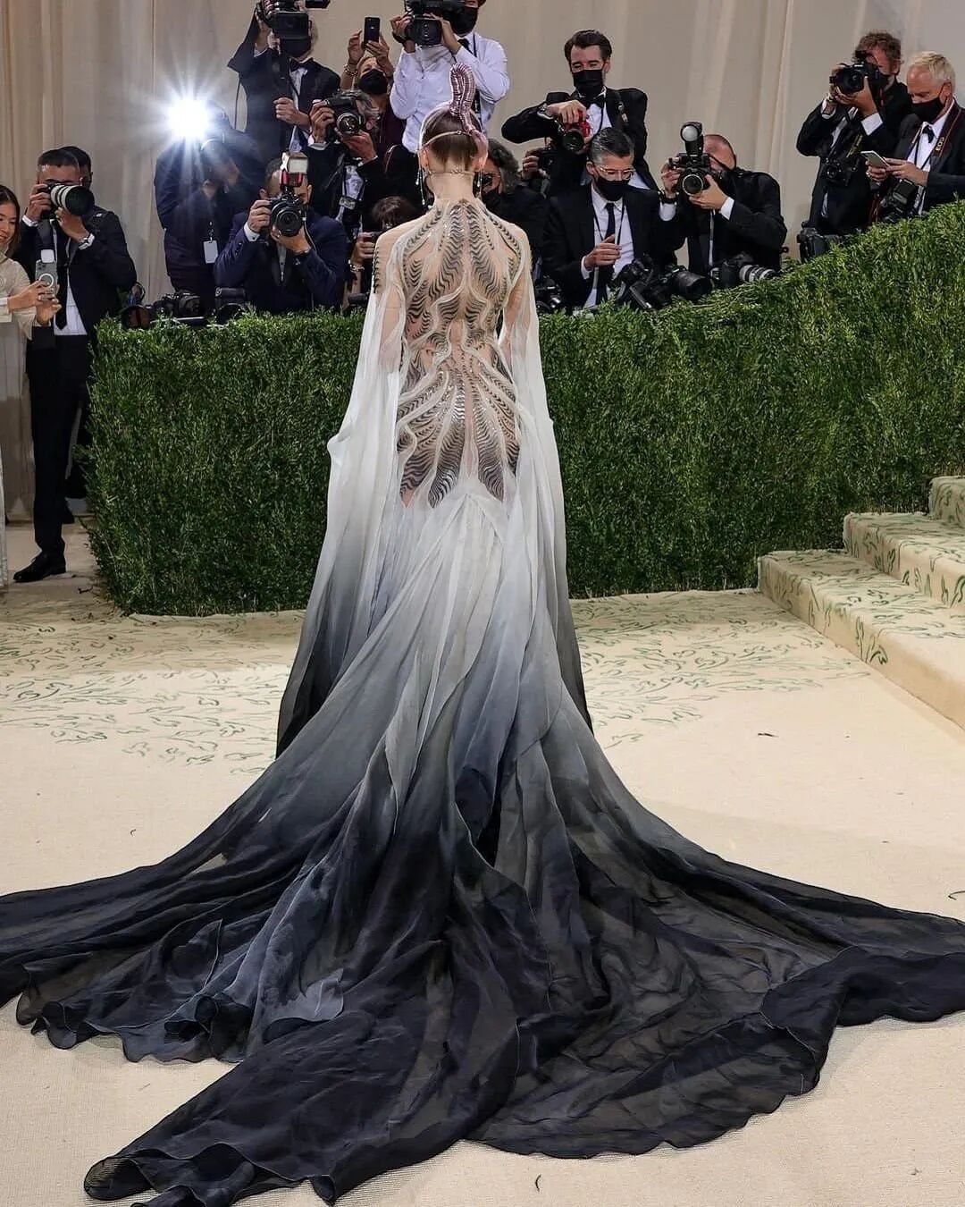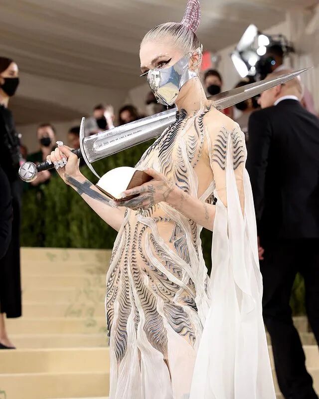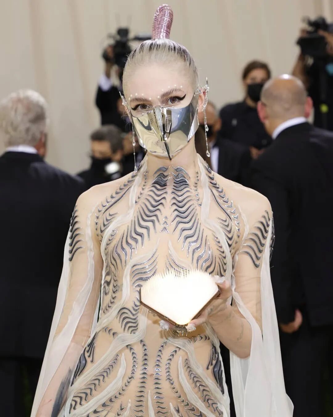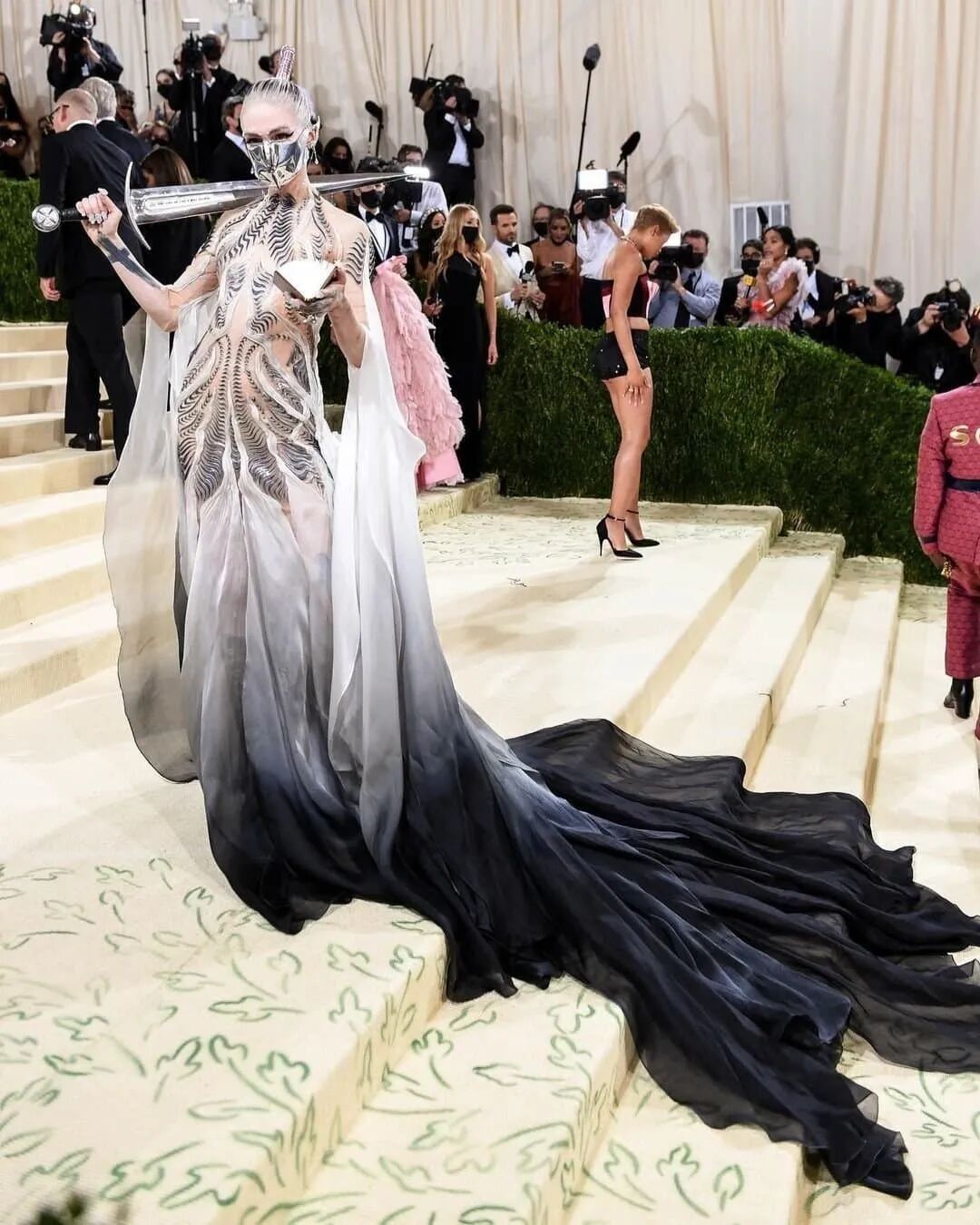 今年 Grimes 则穿着由 Van Herpen 使用 3D 技术定制设计的礼服,登上了 2021 年 Met Gala 的红地毯。