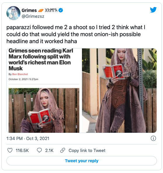 Grimes 收获了一段美好的感情体验和可爱的孩子,工作不依附对方,又能把她自己的名字和「马斯克的女友」分离开。不论生活中发生什么样的变化,她从来都是那个叛逆、特立独行的“怪妹”Grimes,也许也正这深植于她心底的独立和坚持,才让那么多人爱上她的独一无二。