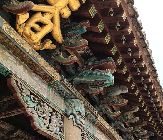 如阴阳鱼饰(八卦图)、十二生肖、龙凤狮象蝙蝠等祥禽瑞兽,通过雕刻彩画油饰等艺术表现手法,大量出现在寺内建筑上,反映出舶来的佛教文化与土生土长的道教文化、儒家文化在民间的深度融合。