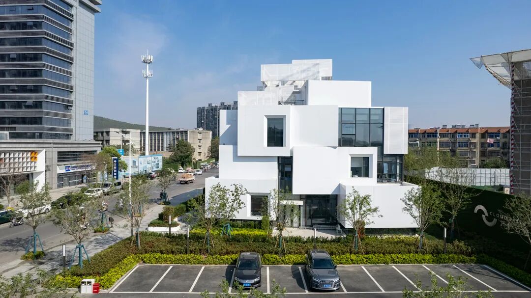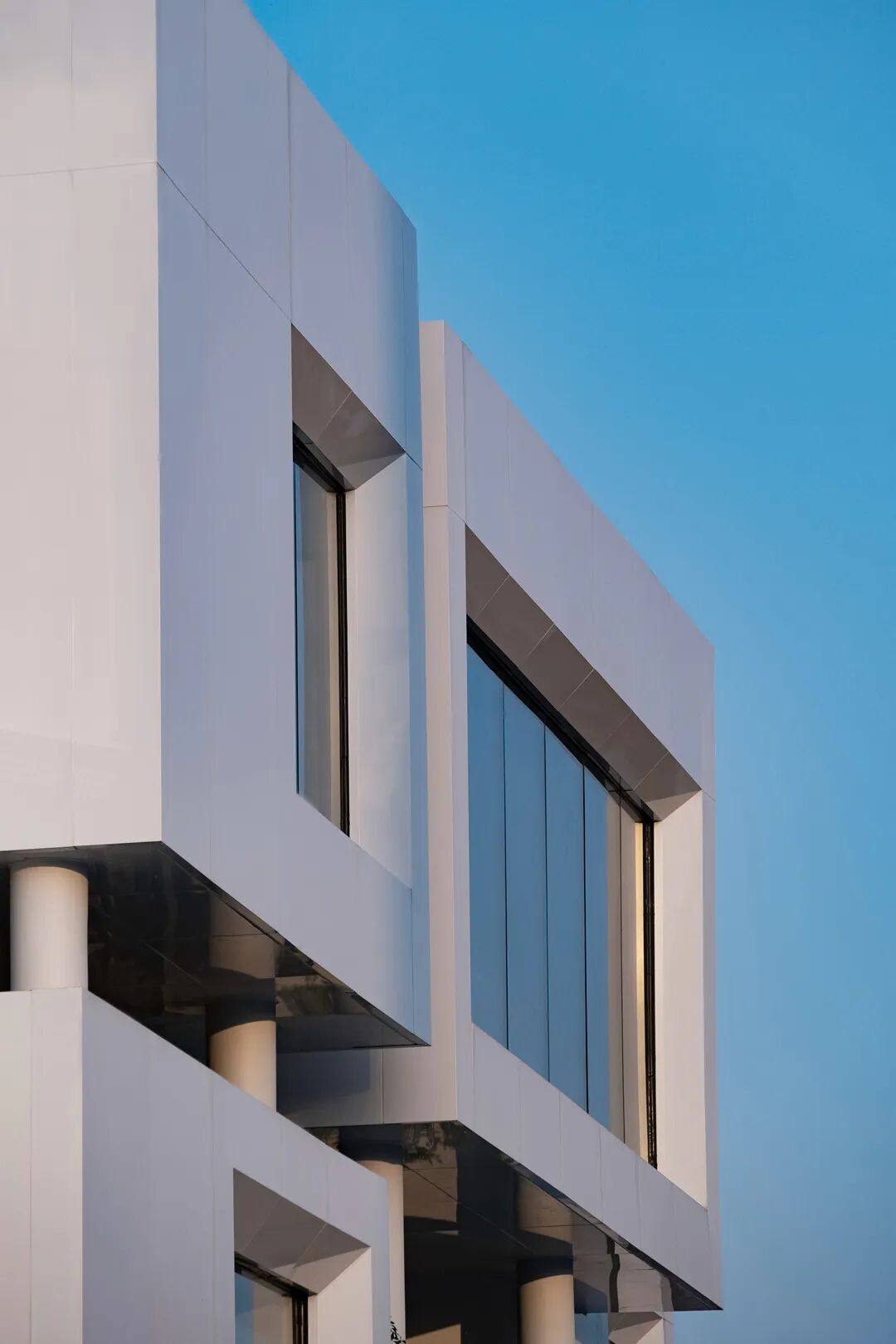 示范区这座山由两部分组成,建筑本体和建筑附加的消防楼梯以及屋顶上的构筑物。前者通过铝板和玻璃塑造出了实的体积,而后者用穿孔铝板创造了虚的形体。虚实相辅相成地构成了凡人生活的纪念碑山。