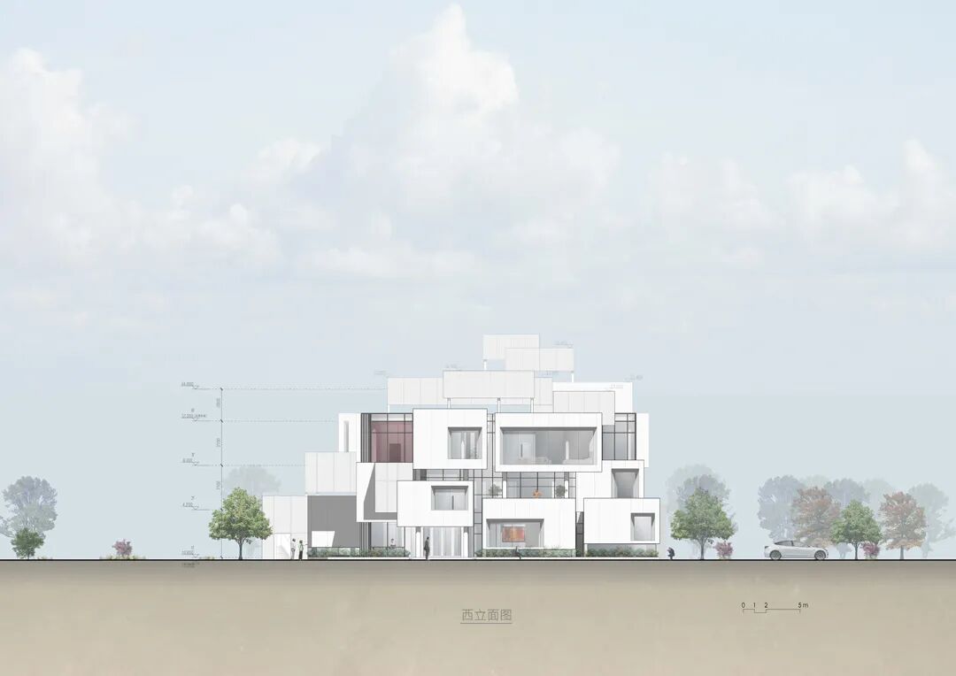 然后,我把这些盒子参考台口开设大窗或者带有阳台的大窗。一组不占有建筑面积的舞台变出现在立面上了。立面上的盒子不再单纯的是个盒子,而是一个展示“日常生活中的一幕”的舞台。不同舞台可以展示不同的人的不同日常。它们堆叠组合在一起,这个示范区就成为展示普通人日常生活的纪念碑。