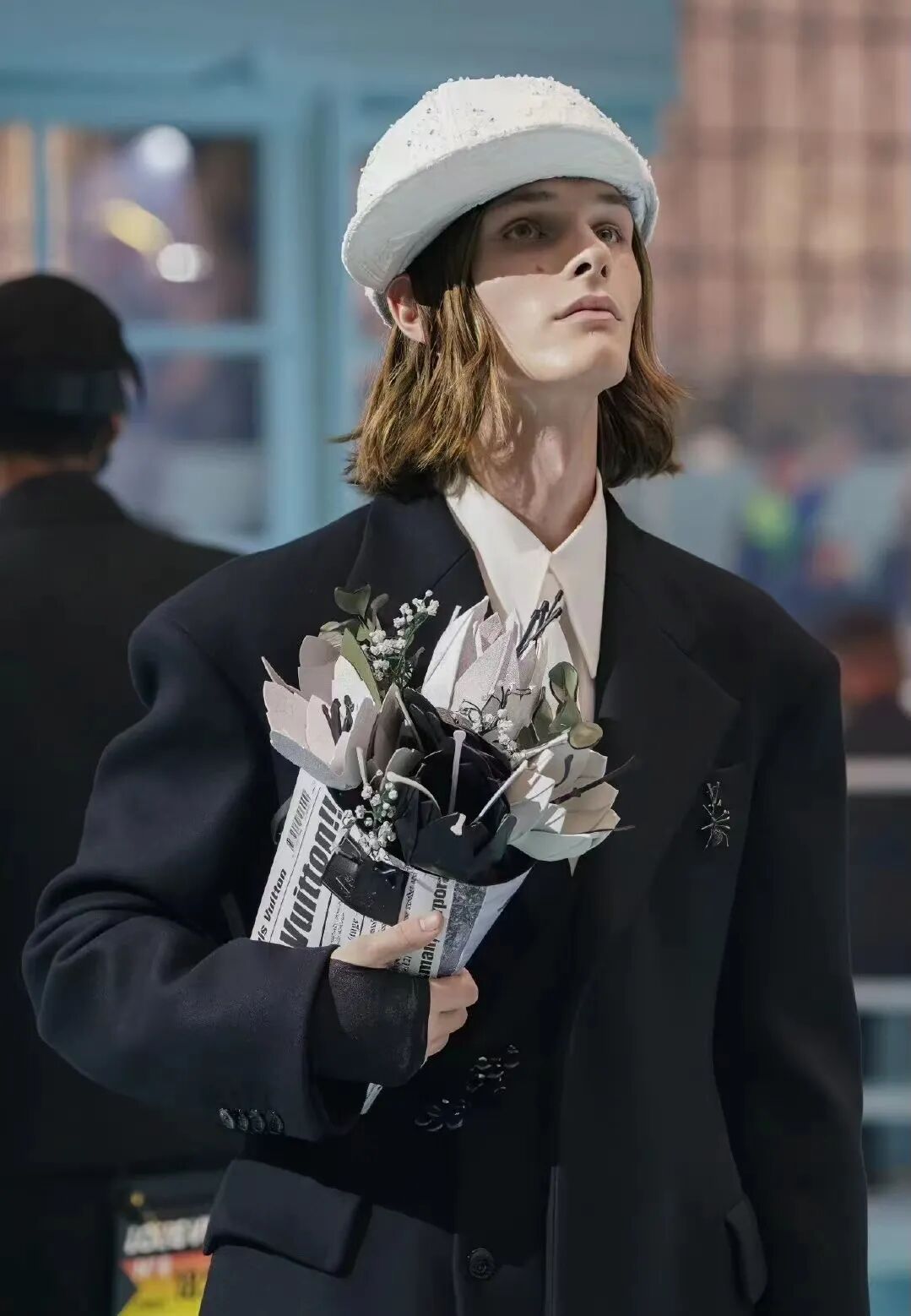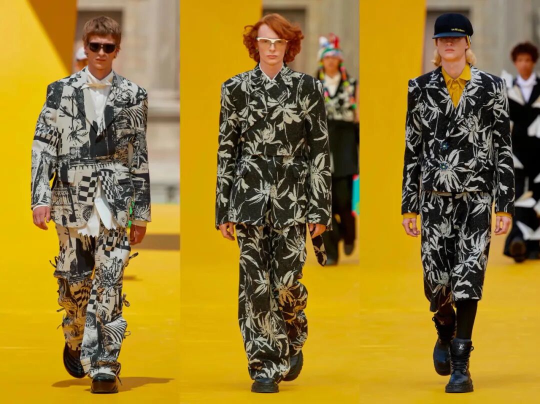 纸飞机点缀的黑色西装、充满花卉的夹克与大衣、溶解效果似的皮质外套,以及从头至尾贯穿的花卉元素,充斥着对 Virgil Abloh 短暂却又璀璨生命的致敬。