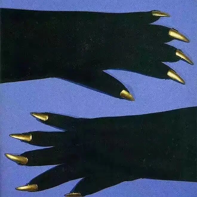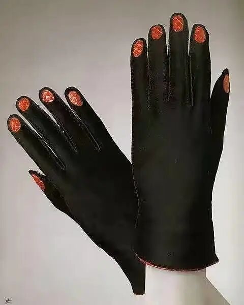 伊尔莎设计了带有“指甲”的手套。在黑色绒面革上,点缀红色的蛇皮指甲。