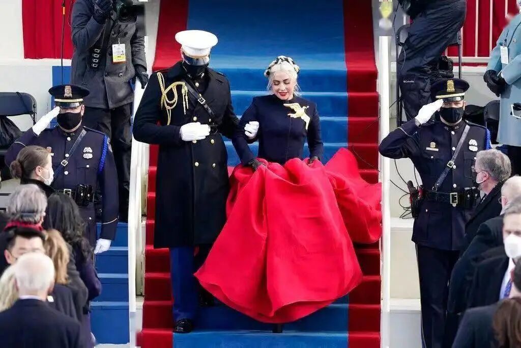 Lady Gaga在美国总统拜登就职仪式上,就穿着胸前有金色和平鸽的Schiaparelli献唱。